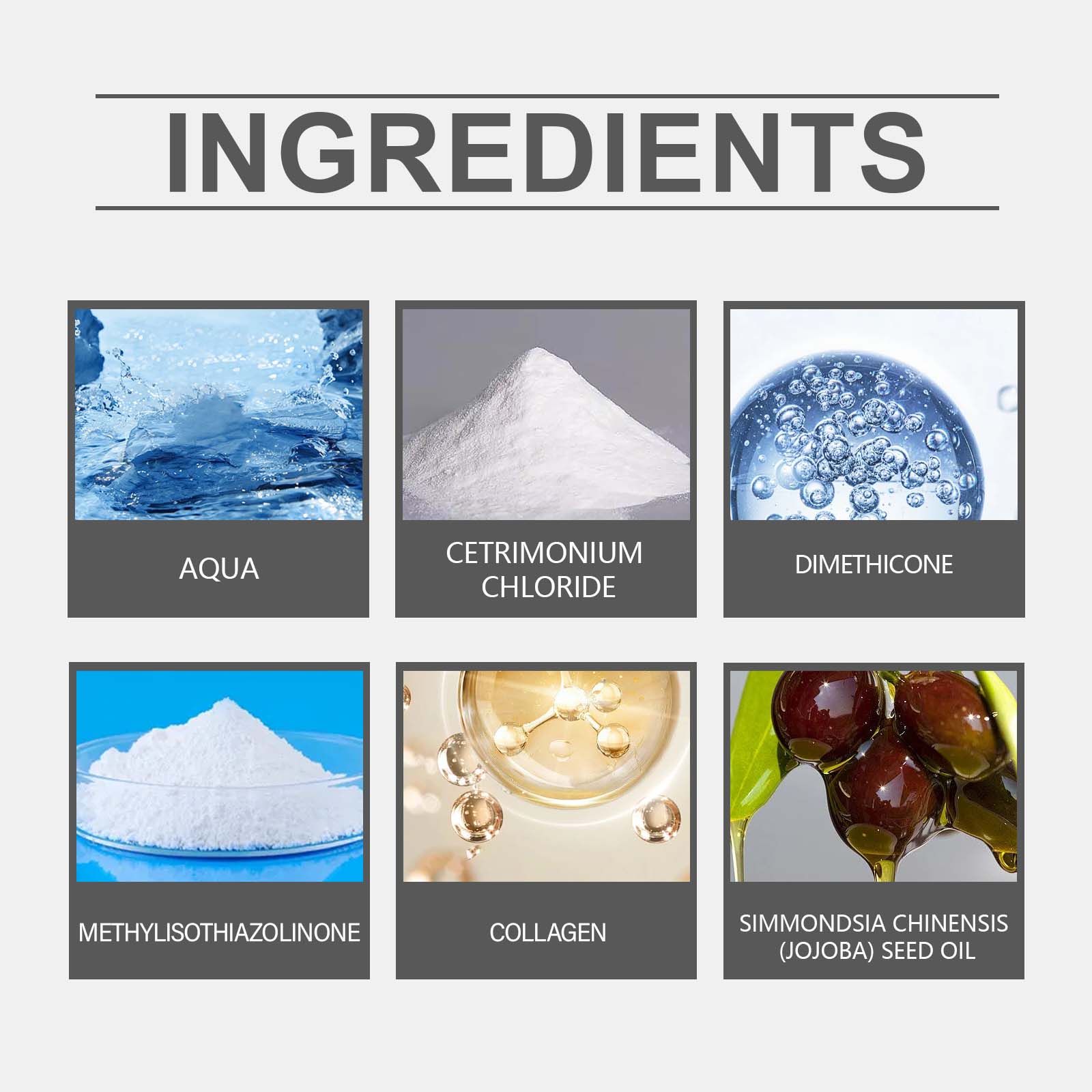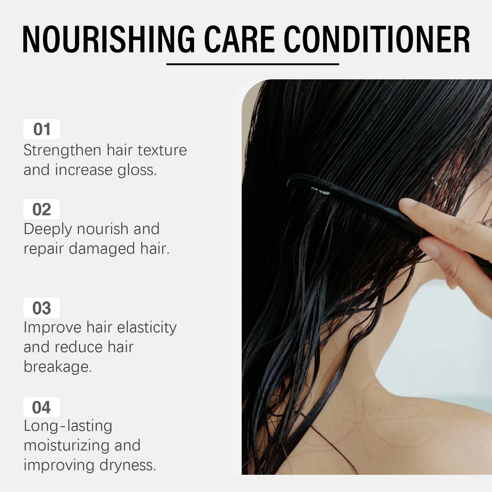 Our Nourishing conditioner contains cetroxonium chloride and polydimethylsiloxane. It can deeply nourish hair and repair damaged hair. Gives shine to hair, making it smoother and brighter. The way to use it is simple: moisturize your hair, apply an even amount to your hair, massage gently to absorb and rinse with water. And can provide comprehensive nutrition, enhance hair elasticity and toughness.