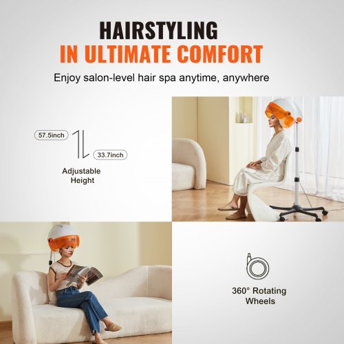 VEVOR Professional Hooded Dryer, 1875W High-Power Bonnet Hair Dryer, Sit Under Hair Dryer with Timer, 3 Temp Settings & Wind Speed, Floor Standing Rolling Base with Wheels for Beauty Salon Home SpaUnique Large Bonnet HoodCustomizable Wind Speed & Heat SettingsAdjustable HeightEnjoy Professional Hair TreatmentUltimate Hair Care ExperienceSmooth MovementTimer: 0-60 Minutes,Adjustable Height Range: 33.7 - 57.5 in / 856 - 1460 mm,Temperature Settings: 3 Levels,Item Model Number: JY-173A,Product Weight: 11.2 lbs / 5.1 kg,Negative Ion Function: No,Wind Speeds: 3 Levels,Product Dimensions: 57.1 x 29.5 x 29.5 in / 1450 x 750 x 750 mm,Hood Diameter: 12.2 in / 310 mm