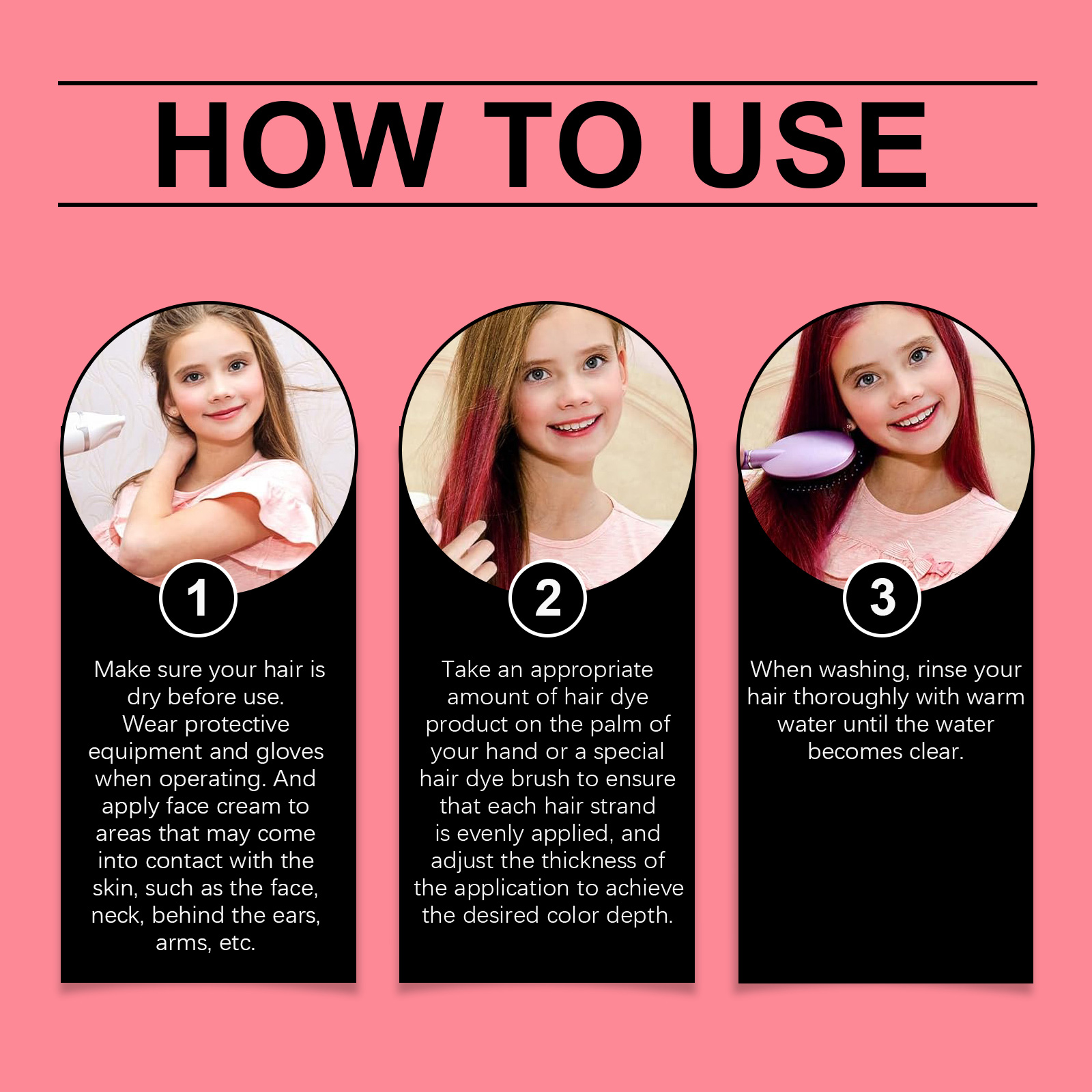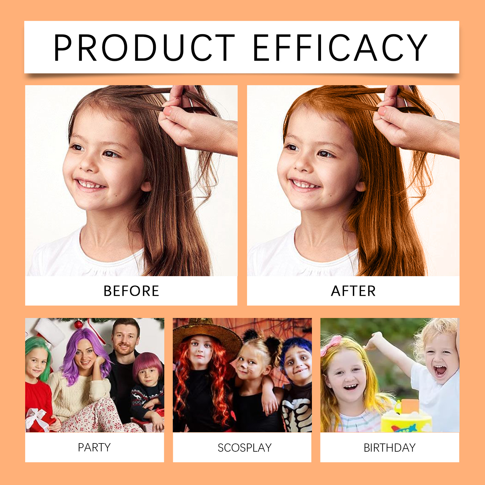 Our children's color hair balm contains glycerin, ginseng extract, sweet almond oil. It is easy to rinse and does not require professional products to remove color. Provides instant and satisfying hair color results and can be easily removed by washing. The way to apply it is simple: make sure your hair has the right amount of hair dye product in the palm of your hand, or use a special hair dye brush to make sure each strand of hair is evenly applied, and adjust the thickness of the application to achieve the desired color depth. When washing your hair, rinse your hair thoroughly with warm water until the water runs clear. Dry before use. Wear protective equipment and gloves when operating. Apply the cream to areas that are likely to touch the skin, such as the face, neck, behind the ears, arms, etc. And designed for children to protect delicate scalp and hair.