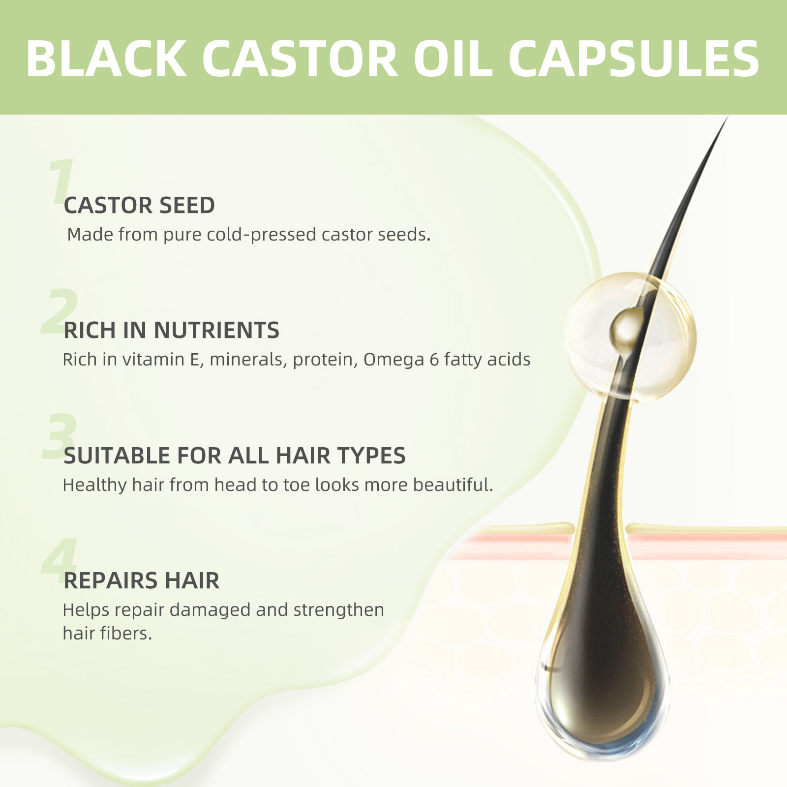 Our castor oil capsule contains castor oil. It protects your hair and keeps it hydrated. The fatty acids in it can also replenish hair oils and store vitality. Healthy hair permeates from the roots to the ends; Repair split hair, dry hair, damaged hair. Penetrate deep into the roots of your hair to make it look thicker and brighter. The way to use it is simple: 1. Pinch the capsule with your hand and squeeze the essential oil into your hand. 2. Apply the oil evenly to your hair and scalp. 3. Gently massage with fingertips to absorb. 4. Use it daily for better results. Castor oil Tight Hair capsules repair hair, help repair damaged and strengthen hair fibers. Suitable for all hair types, healthy hair from head to toe looks even better.