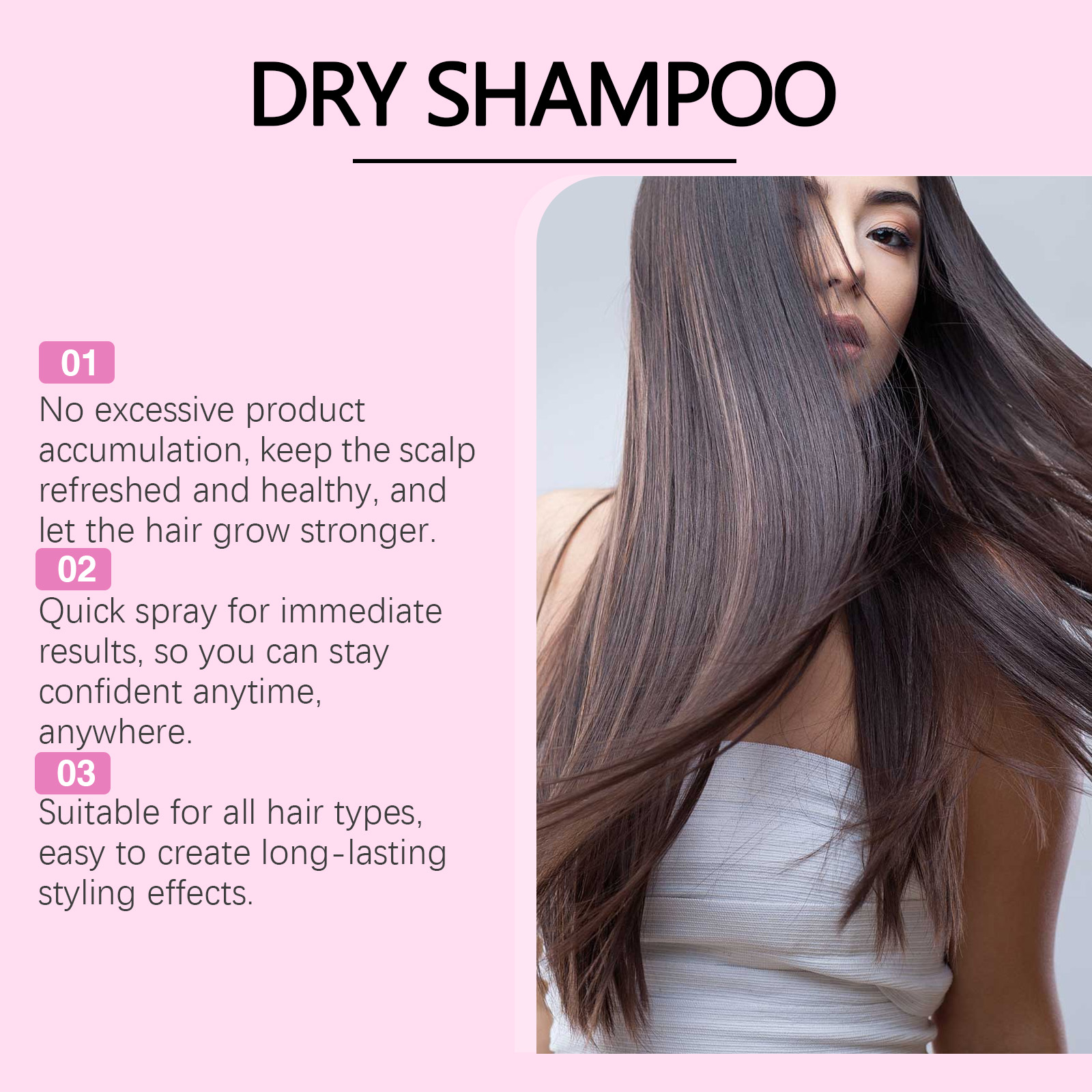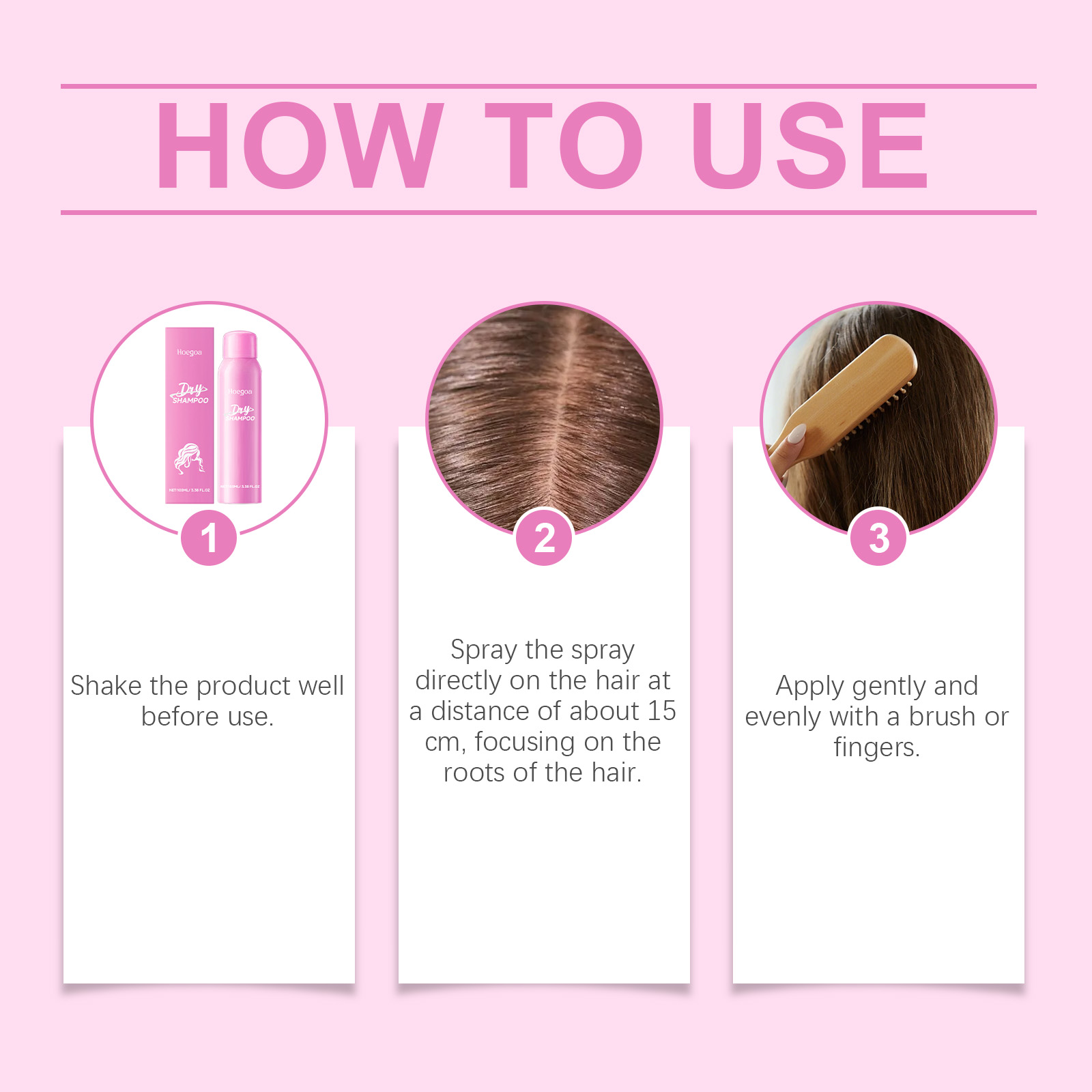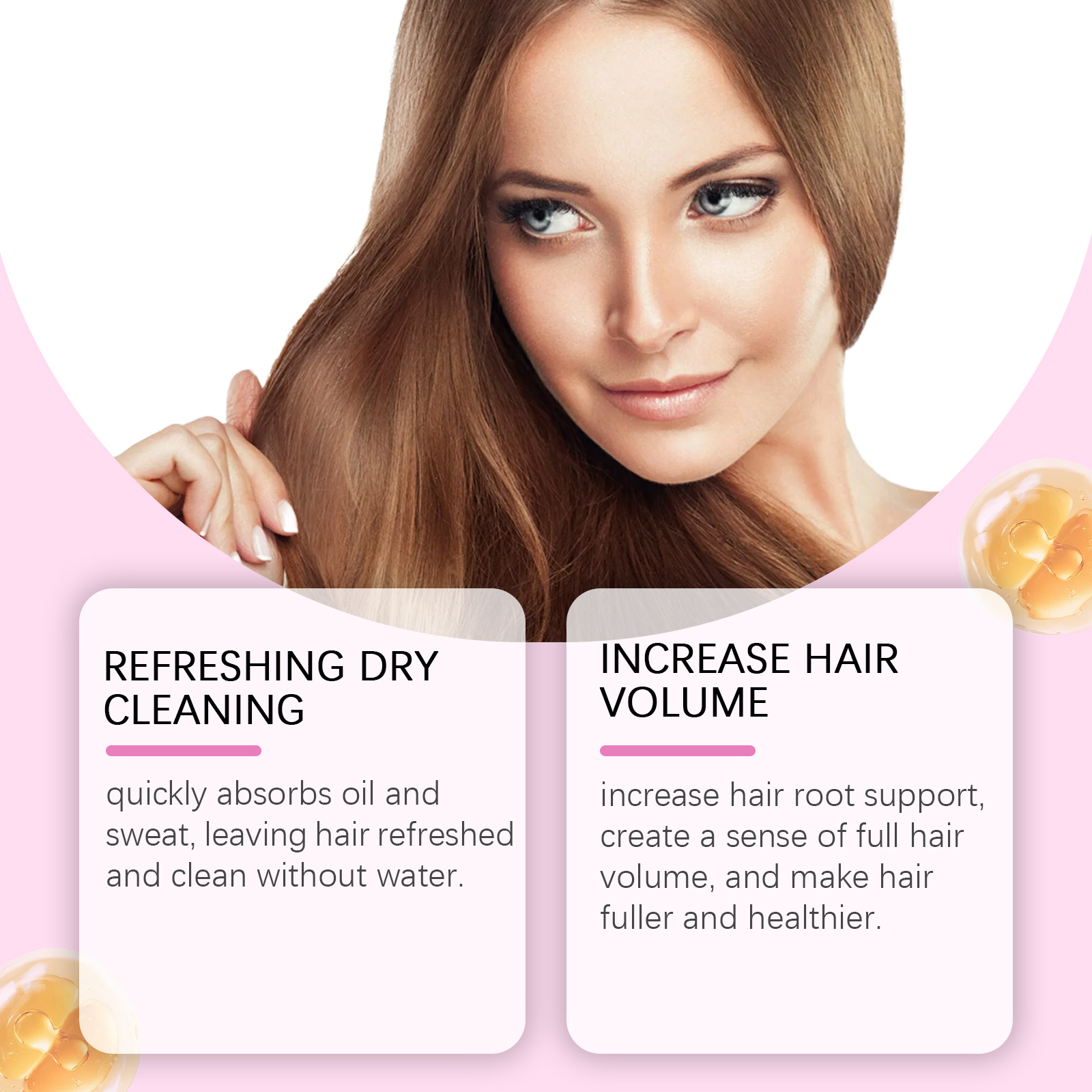 Our leave-in dry hair spray contains aluminum starch octenyl succinate, soluble collagen. It absorbs oil and sweat quickly, leaving hair fresh and clean without water. The way to use it is simple: shake the product before use, spray the spray directly on the hair, about 15 cm away, focusing on the roots of the hair, and gently and evenly apply it with a brush or fingers. It can also increase the root support of the hair, creating a sense of full hair volume, making hair fuller and healthier.