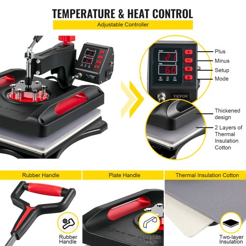 VEVOR Upgrade Heat Press Machine ETL Safety Certification 15 x 15 in 8-in-1 Heat Press Power-Saving Sublimation Machine 360°Rotation Heat Press Shirt Printing Machine for Shirts Cap & Mugs RedPrecise Digital DisplayDouble Tube HeatingSecurity Anti-scaldingUser-friendly DetailsTrusted PerformanceComplete AccessoriesPlate Press #1: 8" max diameter,Plate Press #2: 10" max diameter,The Highest Temperature: 210 ℃/410 °F,Rated Voltage: 110V,Product Size: 51 x 40 x 47 cm/20.07 x 15.75 x 18.51 inch,Rated Frequency: 60 Hz,Hat/Cap Press: 6" x 3" (curved),Model Nunber:ZHJ-38B,Mug Press #3: 3"-3.5" diameter (11 OZ),Mug Press #4: 17 OZ,Rated Power: 1000W,Mug Press #1: 9 OZ,Transfer Size: 15" x 15" (38 x 38 cm),Mug Press #2: 12 OZ