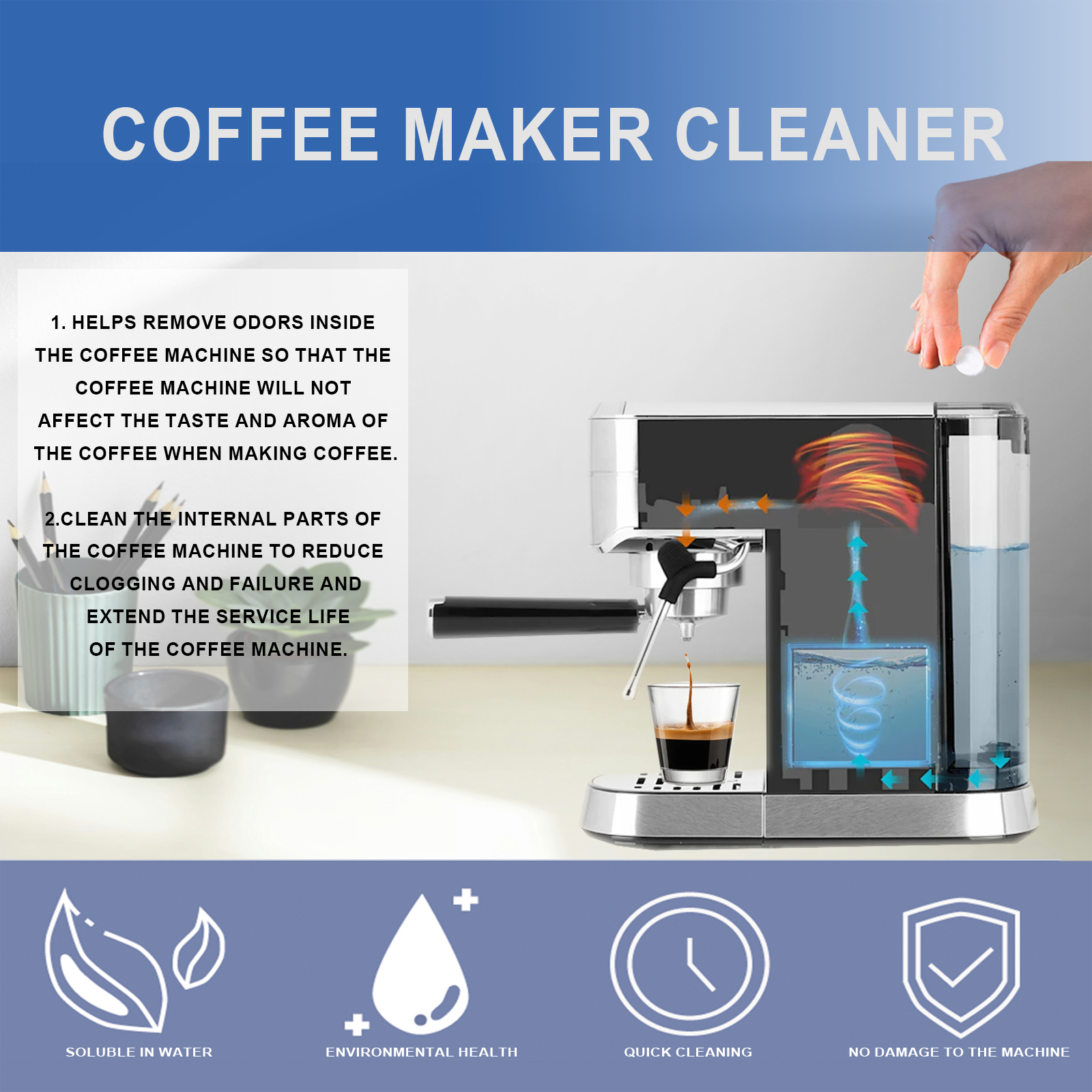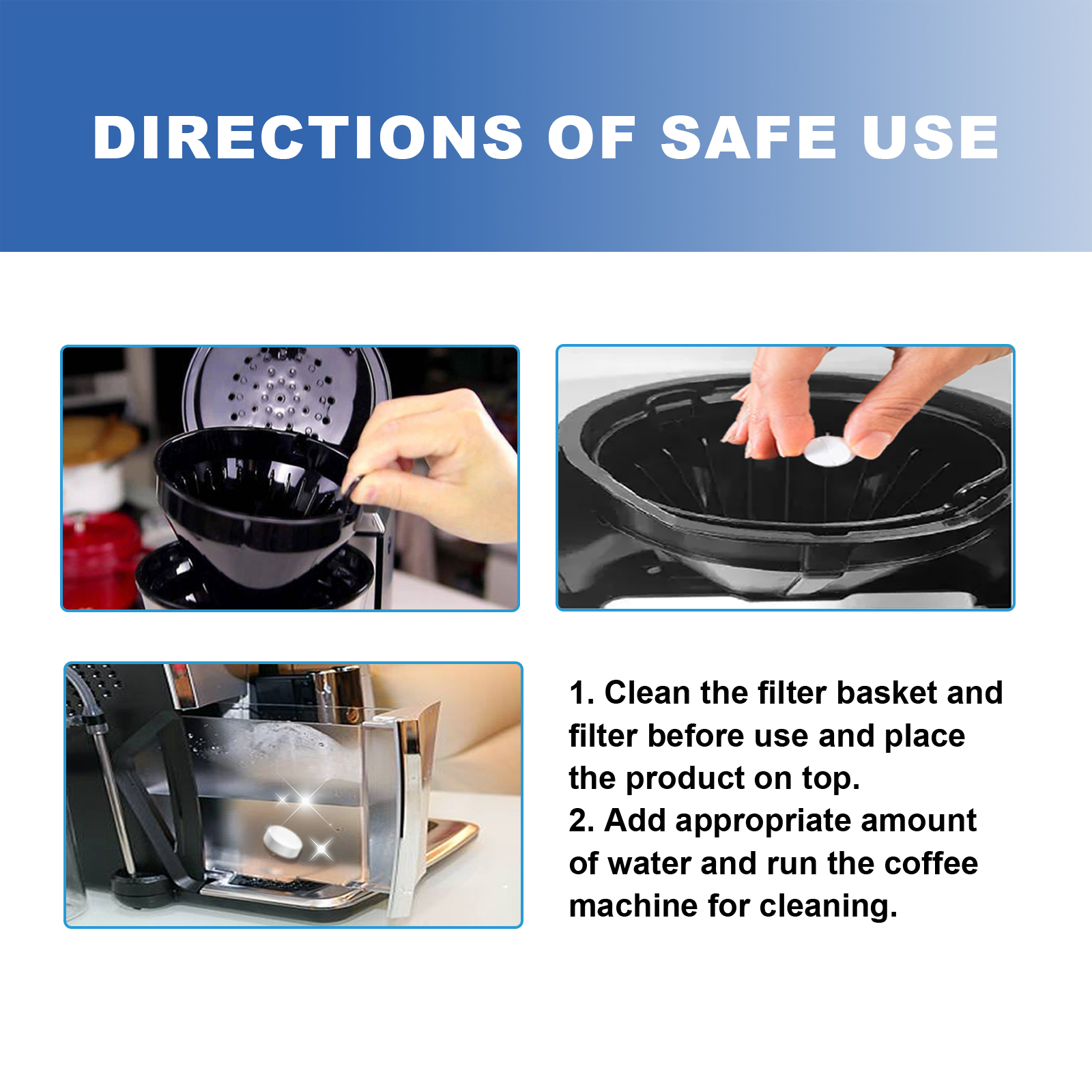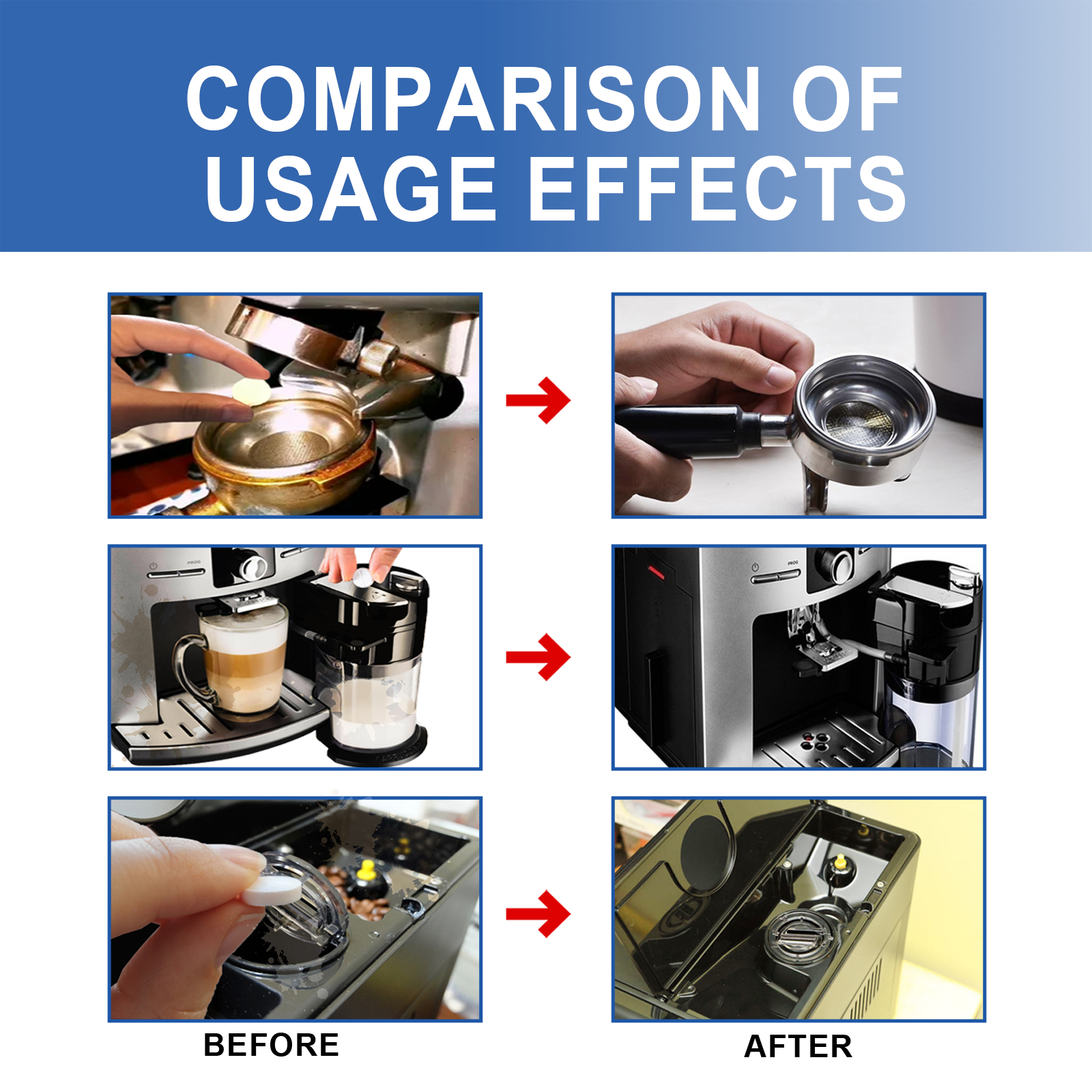 Our coffee machine cleaning tablets contain peppermint leaf extract, lemon fruit extract. It can help remove the odor inside the coffee machine, so that the coffee machine will not affect the taste and aroma of the coffee when making coffee, clean the internal parts of the coffee machine, reduce blockage and failure, and extend the service life of the coffee machine. Its use method is very simple: before use, please clean the filter basket and filter, and put the product on it, add the right amount of water, start the coffee machine for cleaning. And it cleans coffee stains.