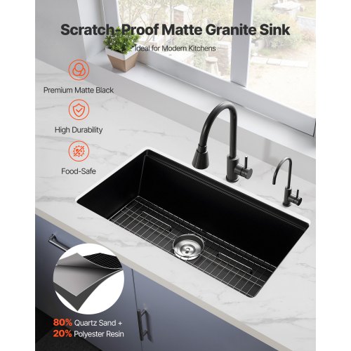 33 inch Granite Kitchen Sink Undermount Single Bowl Drop-In Basin for RV Bar<br/>Undermount Style<br/>Reliable Material<br/>Qucikly Clean<br/>Sleek Under-mount Integration<br/>Secure Packaging<br/>Check Items Included<br/>Type: Undermount,Roll-Up Rack Size: 17x12 inch / 42x29.5 cm,Bamboo Board Size: 17x10 inch / 42x26 cm,Grid Size: 28x13 inch / 71.5x34 cm xR15,Color: Black ,Item Model Number: 838482-SS ,Product Net Weight: 41.22 lb / 18.7 kg (including all accessories),Sink Internal Size: 31x17x10 inch / 782x432x254mm,Sink External Size: 33x19x10 inch / 838x482x254 mm,Min. Cabinet Size: 35x22 inch / 900x550 mm,Main Material: Quartz sand & Resin,Min. Recommended Cutout Size: 31x17 inch / 782x432 mm