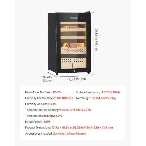 70L Electric Cigar Humidor Cooler Cabinet 400 Counts with Compressor Cooling<br/>70L Electric Cigar Humidor, Temperature & Humidity Control<br/>Stable Temperature & Humidity<br/>Thoughtful Details<br/>Ideal Choice<br/>Sleek & Elegant Design<br/>Low Noise Operation<br/>Voltage/Frequency: AC 115V 60Hz,Operating Humidity: 20%-95%,Temperature Accuracy: ±35.6℉/2℃,Product Type: With Humidification Function, Bottom Water Tank,Ambient Temperature Range: 0 to 89.6℉/1°C to 32°C,Humidity Accuracy: ±3%,Item Model Number: JC-70,Humidity Control Range: 60-80% RH,Rated Power: 85W,Temperature Control Range: 59 to 72 ℉/15 to 22 ℃,Product Dimensions: 17.72 x 16.54 x 29.33 in/450 x 420 x 745 mm,Net Weight: 51.37 lbs/23.3 kg