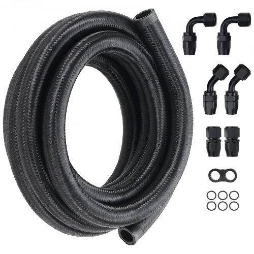 VEVOR 10AN Fuel Line Kit, 10 FT Fuel Hose Kit, 0.55" Nylon Stainless Steel Braided Fuel Line Oil/Gas/Diesel Hose End Fitting Kit, with 7 PCS Swivel Fitting Adapter Kit, BlackVersatile 10AN Hydraulic HoseFuel CompatibilityDurable ConstructionKeep The Lines OrdelyEasy InstallationSecure PackagingOuter Diameter: 0.78 in,Burst Pressure: 2000 psi,Maximum Working Pressure: 500 psi,Fuel Hose Size: 10AN,Inner Diameter: 0.55 in,Item Model Number: CPE-10AN-10ft,Working Temperatures: -40°F to 257°F,Material: Nylon, Stainless Steel, CPE Rubber, Aluminum Alloy,Fuel Line Length: 10 ft,Product Dimensions: 0.78 x 0.78 x 120 in / 20 x 20 x 3048 mm,Net Weight: 2.57lb / 1.17 kg (all accessories included)