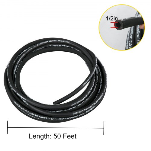 VEVOR Hydraulic Hose 50 Feet Rubber Hydraulic Hoses with 2 High-Tensile Steel Wire Braid, Inner Diameter 1/2 Inch, 5000 PSI Max, Bulk Hydraulic Hose -40 °F to 250 °F, Hydraulic Oil Flexible Hose50 Ft Hydraulic Hose5000 PSI Max PressureTough MaterialCorrosion ResistanceFlexible HoseWide-range ApplicationOuter Diameter: 7/8" (2.22 cm),Reinforcement Material: 2 Steel Wire Braids,Maximum Working Pressure: 5000 PSI,Length: 50 Feet (15 Meters),Explosion Pressure: 15940 PSI,Inner Diameter: 1/2" (1.27 cm),Color: Black,Model: 50 Ft Hydraulic Hose,Temperature Range: -40-250 °F / -40-121 °C,Material: Rubber,Weight: 46 lbs / 21 kg
