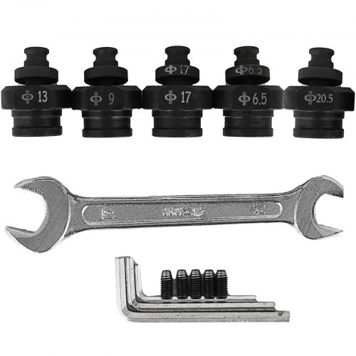 VEVOR Hydraulic Hole Puncher Cutting Thick 1/4",Electric Hydraulic Hole Punching Tool w/ 5-Dies Set,Hydraulic Metal Hole Puncher w/Manual Oil Return Switch, Hydraulic Hole Punch Machine 900WStable Penetration900W High PowerFive Applicable DiesDurable Open ButtonAuxiliary Handle DesignVarious UsesIron / Steel Plate: Thickness ≤ 6 mm/0.2 in,Copper/Aluminum Plate: Thickness ≤ 8 mm/0.3 in,Maximum Output: 10 T/ 22046 lbs,Throat Depth: 40 mm/1.57 in,Model: MPH-20,Motor Power: 900W,Punching Speed: 2-3s,Dies Size: 1/4", 3/8", 1/2", 5/8", 3/4"(6.5, 9, 13, 17, 20.5 mm),Cutting Thick: 1/4 in,Rated Voltage: 110V±15%, 50/60Hz
