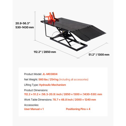 Motorcycle Jack Lift 1500lb Pneumatic Motorcycle Hoist Stand Removable WorkbenchX BracketReinforced Screw JackLarger WorkbenchSecurity LockWide CompatibilityCompact Storage112.2 × 51.2×(56.3-20.9)inch / 2850 × 1300×(1430-530)mm:,Pressure Range: 1.6 MPa,Lifting Type: Pneumatic,Maximum Lifting Height: 37 inches / 940.2 mm,Airbag Model: 300H-3,Dimensions: 17.7 x 5.9 x (3.5-16.5) inches / 450 x 150 x (90-420) mm,Product Dimensions:,Minimum Lifting Height: 7 inches / 177.8 mm,Thickness: 0.1 inch / 2.5 mm,Workbench Dimensions(L x H): 78.7 x 48 inches / 2000 x 1220 mm,Load Capacity: 1500 lbs,Item Model Number: JL-M03804,Surface Treatment: Powder Coating,Center Jack Material: Q235B,Center Jack Load: 1100 lbs,Net Weight: 560 lbs / 254kg,Airbag Material: Rubber,Thrust: 3t