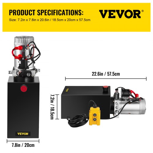 VEVOR Hydraulic Pump, 10 Quart Hydraulic Power Unit, Single Acting Hydraulic Pump, 12V DC Hydraulic Pump (Steel Reservoir, Single Acting, 3200 PSI) w/SAE#6 Connector for Dump Trailer Car LiftingSingle-Acting Power UnitConvenient DesignQuick Start&LiftingLong LastingSimple InstallationWide ApplicationConnector: SAE # 6,Max. Relief Valve Setting B Port: 1500 PSI,Traffic: 1.1 cc/r,Mount Position: Horizontal/ Vertical,Rotation: Clockwise,Flow: 2.0 GPM,Max. Relief Valve Setting A Port: 3200 PSI,Tank Capacity: 10L/ 10Quart/ 2.5 Gal,Control: Solenoid and Handheld Pendant,Rated Speed: 2850R/MIN,Duty: 3 Min,Voltage: DC12V,Model: 10QSAMHP,Pendant Control Length: 15ft/ 4.5 m,Tank Material: Metal,Power: 1.6KW (Rated), 3.0KW (Max)
