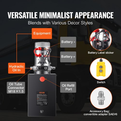 VEVOR Hydraulic Pump, 12 Quart Hydraulic Power Unit, Single Acting Dump Trailer Pump, 0.91 GPM Flow Rate, 3200 PSI Max Relief Pressure, DC 12V Hydraulic Pump for Dump Trailer Car LiftingHeavy Machinery Made EasyBuilt to LastSafety FirstProfessional-Grade PerformanceSimplified SetupEffortless Flow ControlFlow Rate: 0.91GPM,Rotating Speed: 2600r/min,Type: Single-action,Voltage: DC12V,Traffic: 1.1 mL/r,Item Model Number: ZXDC12V-1.6KW-D-12L,Material: Steel (GC01),Product Dimensions: 21.9×7.9×9 inch/557×200×228 mm,Net Weight: 31.4 lbs/14.25 kg,Reservoir Capacity: 12 Quart/3 Gal,Max. Pressure: 3200 psi,Power: 1.6 kW