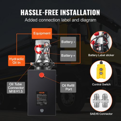 VEVOR Hydraulic Pump, 15 Quart Hydraulic Power Unit, Double Acting Dump Trailer Pump, 0.91 GPM Flow Rate, 3200 PSI Max Relief Pressure, DC 12V Hydraulic Pump for Dump Trailer Car LiftingHeavy Machinery Made EasyDouble the EfficiencySafety FirstProfessional-Grade PerformanceSimplified SetupEffortless Flow ControlFlow Rate: 0.91GPM,Rotating Speed: 2600r/min,Type: Double-action,Voltage: DC12V,Traffic: 1.1 mL/r,Item Model Number: ZXDC12V-1.6KW-S-15L,Material: Steel (GC01),Product Dimensions: 23.4×8.3×9.6 inch/595×212×243 mm,Net Weight: 33.2 lbs/15.05 kg,Reservoir Capacity: 15 Quart/3.75 Gal,Max. Pressure: 3200 psi,Power: 1.6 kW