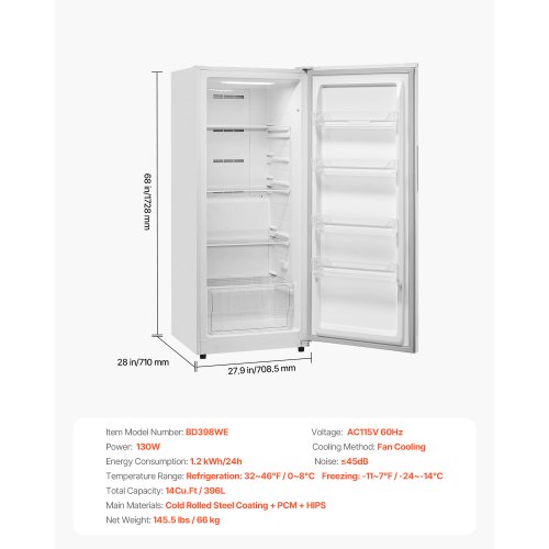 Convertible Freezer/Refrigerator 14 Cu.Ft Frost Free Upright Freezer HomeUpright Freezer/RefrigeratorFan Cooling SystemAutomatic Defrost DesignFlexible Storage SpaceVersatile UseLED LightTotal Capacity: ≤14Cu.Ft / 396L,Main Materials: Cold Rolled Steel Coating + PCM + HIPS,Noise: ≤45dB,Voltage: AC115V 60Hz,Cooling Method: Fan Cooling,Item Model Number: BD398WE,Energy Consumption: 1.1 kWh/24h,Temperature Range: 32~46°F / 0~8°C (Refrigeration), -11~7°F / -24~-14°C (Freezing),Product Dimensions: 28 x 27.9 x 68 in / 710 x 708.5 x 1728 mm,Net Weight: 145.5 lbs / 66 kg,Power: <130W