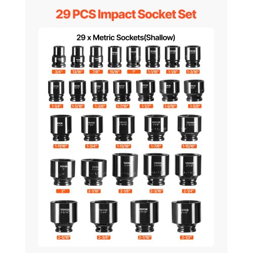 VEVOR Impact Socket Set 3/4 Inches 29 Piece Impact Sockets, 6-Point Sockets, Rugged Construction, CR-M0, 3/4 Inches Drive Socket Set Impact SAE 3/4 inch - 2-1/2 inch, with a Storage CageRugged Construction6-Point Socket DesignEasy-to-Read Size Markings29 Sockets IncludedSturdy Storage CaseWide ApplicationImpact Sockets Set: 29 Pieces,Package Dimensions: 24.6 x 13.6 x 4 inches / 62.5 x 10 x 34.5 cm,Style: Shallow, 6 Point,Material: CR-M0,Drive Size: 3/4 inch