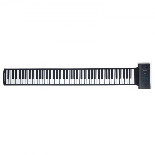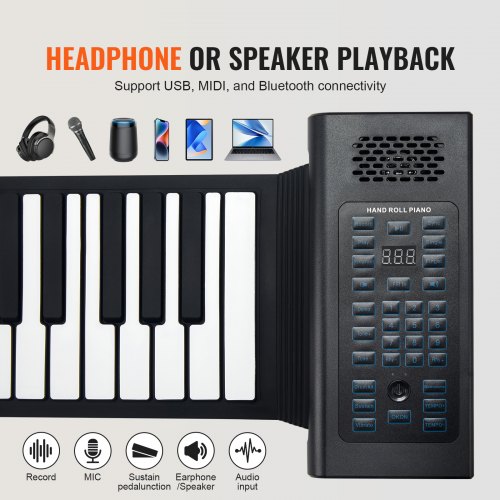 VEVOR 88 Key Roll Up Piano Portable Hand Roll 128 Rhythms Tones RechargeableCompact and PortablePerfect for Music EducationDurable Silicone KeysConnect to Headphones or SpeakersClear LED DisplayEducational ValueNumber of Keys: 88,USB Charging/MIDI Transmission:,Item Model Number: BR-A-88,Product Weight: 3.26 lbs/1.48 kg,1/4 in (3.5 mm) Audio Output Port,:,Bluetooth Transmission: 4.0,Interface Types:,1/4 in (3.5 mm) Sustain Pedal Port,:,Product Dimensions: 53.5 x 9 x 1.2 in/1360 x 230 x 30 mm,1/4 in (3.5 mm) Microphone Port,:,1/4 in (3.5 mm) Audio Input Port,:,Main Material: Silicone
