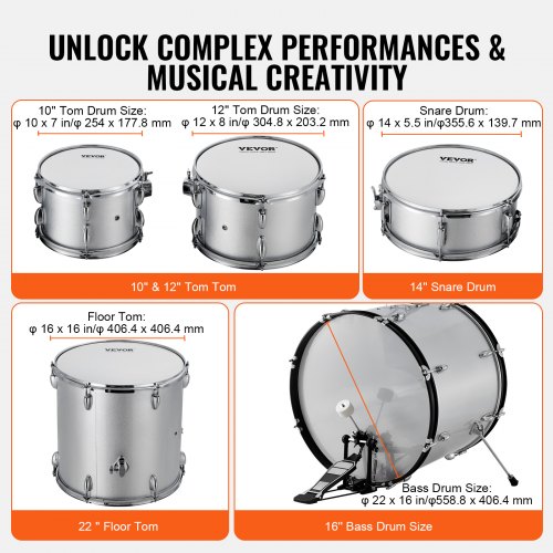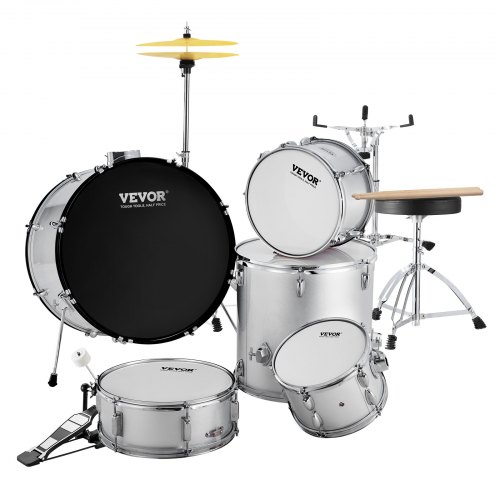 VEVOR Adult Drum Set, 5-Piece, 22 inches Complete Full Size Drum Kit with Bass Toms Snare Floor Drum Adjustable Throne Stands Cymbal Hi-Hat Pedal and Drumsticks, Beginner Drum Kit for Adults, Silver5-Piece Adult Drum Set, Ignite Your Musical JourneyProfessional DrumEye-Catching DesignEasy ControlSolid ConstructionEasy InstallationNumber of Drums: 5,Color: Silver,Item Model Number: SH-003-SY,Net Weight: 67.2 lbs / 30.5 kg,Main Material: Poplar, PET, Carbon Steel