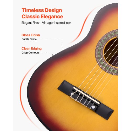 VEVOR Classical Guitar 30 in Guitar Beginner Starter Kit Nylon Strings Sunburst<br/>Nylon Strings<br/>Durable Wood Construction<br/>All-in-One Starter Kit<br/>Effortless to Tune<br/>Multiple Size & Color Options<br/>Ideal Artistic Choice<br/>Top Material: Basswood,Main Materials: Basswood & Maple,String Type: Nylon Strings,Size: 30 in/780 mm,Back Material: Basswood,Color: Sunburst,Item Model Number: M5126