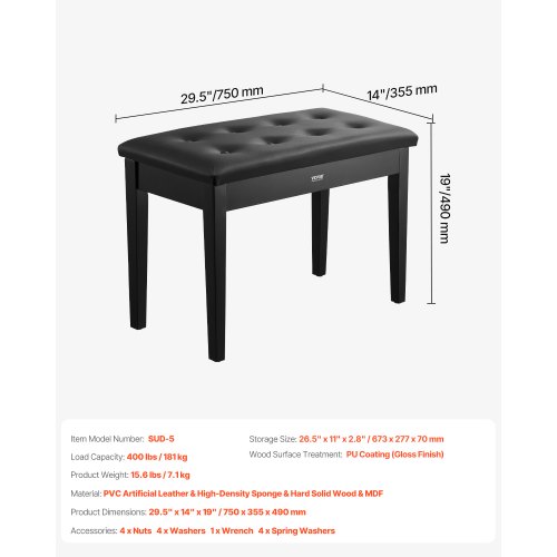 Duet Piano Keyboard Bench Storage Padded Chair Wooden Vanity Bookcase StoolAdjustable Piano BenchHigh-security Metal HingesScratch-resistant and Easy to CleanSturdy and Durable ConstructionEasy AssemblyWaterproof LeatherStorage Size: 26.5" x 11" x 2.8" / 673 x 277 x 70 mm,Load Capacity: 400 lbs / 181 kg,Item Model Number: SUD-5,Product Weight: 15.6 lbs / 7.1 kg,Material: PVC Artificial Leather & High-Density Sponge & Hard Solid Wood & MDF,Wood Surface Treatment: PU Coating (Gloss Finish),Product Dimensions: 29.5" x 14" x 19" / 750 x 355 x 490 mm