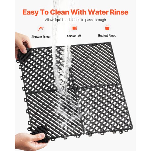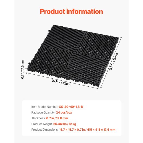 VEVOR Interlocking Drainage Mat, 15.7” x 15.7” Modular Interlocking Cushion Durable PP Material, 24 Pcs Splicing Drainage Mats, Non-Slip Drainage Floor Tile and Shower Mat, for Garage, Garden, Kitchen & Outdoor, BlackTough PP MaterialExtra Thickness for ReliabilitySnap-Together SetupSlip-Resistant SurfaceVersatile for Any SpaceBuilt to LastThickness: 0.7 in / 17.6 mm,Size: 15.7 x 15.7 in / 415 x 415 mm,Item Model Number: GS-40*40*1.8-B,Product Weight: 26.46 lbs / 12 kg,Package Quantity: 24 pcs/box,Product Dimensions: 16.34 x 16.34 x 0.69 in / 415 x 415 x 17.6 mm