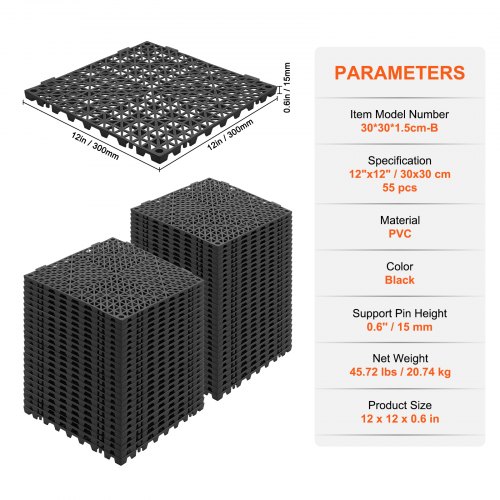 VEVOR Interlocking Tile 55PCS Black, Drainage Tiles 12" x 12" Splicing, PVC Interlocking Drainage Floor Tiles, Non-Slip Drainage Holes for Restroom, Bathroom, Kitchen, Pool, Wet AreasWaterproof and Slip-ResistantFlexibility and DurabilityEffortless AssemblyEffortless MaintenanceVersatile Use55-Piece Drainage MatsSupport Pin Height: 0.6''/15 mm,Color: Black,Item Model Number: 30*30*1.5cm-B,Specification: 12"x 12"/30 x 30 cm, 55 pcs,Material: PVC,Net Weight: 45.72 lbs/20.74 kg,Product Size: 12 x 12 x 0.6 inch/300 x 300 x15 mm