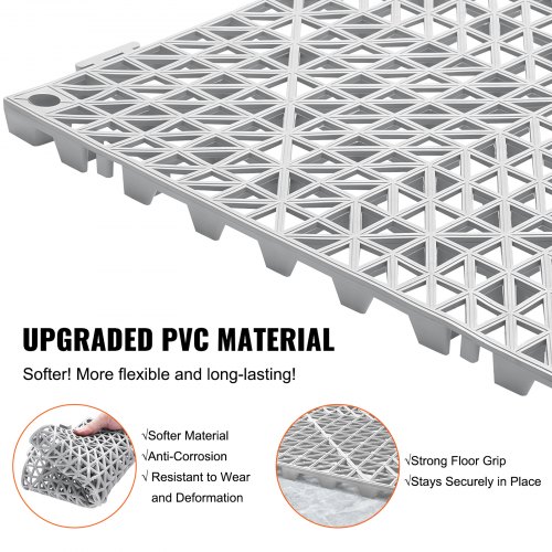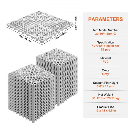 VEVOR Interlocking Tile 55PCS Grey, Drainage Tiles 12" x 12"x 0.6 Splicing, PVC Interlocking Floor Tiles, Non-Slip Drainage Holes for Restroom, Bathroom, Kitchen, Pool, Wet AreaWaterproof and Slip-ResistantFlexibility and DurabilityEffortless AssemblyEffortless MaintenanceVersatile Use55-Piece Drainage MatsSupport Pin Height: 0.6''/15 mm,Color: Gray,Item Model Number: 30*30*1.5cm-G,Specification: 12"x 12"/30 x 30 cm, 55 pcs,Material: PVC,Net Weight: 51.17 lbs/23.21 kg,Product Size: 12 x 12 x 0.6 inch/300 x 300 x15 mm