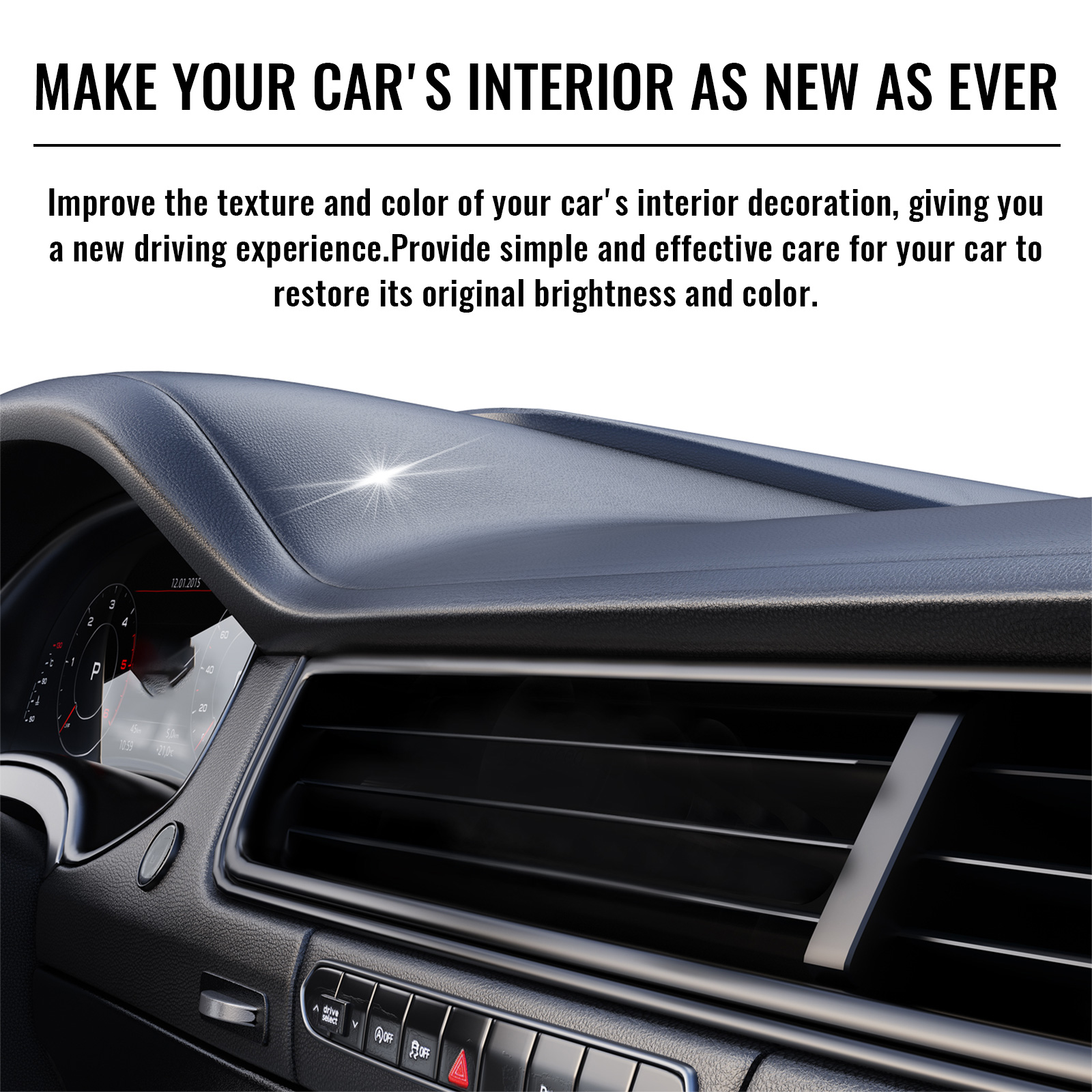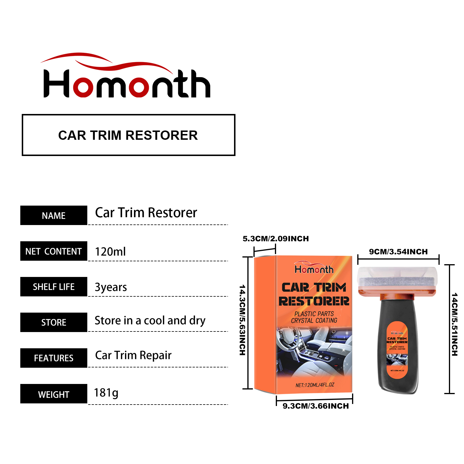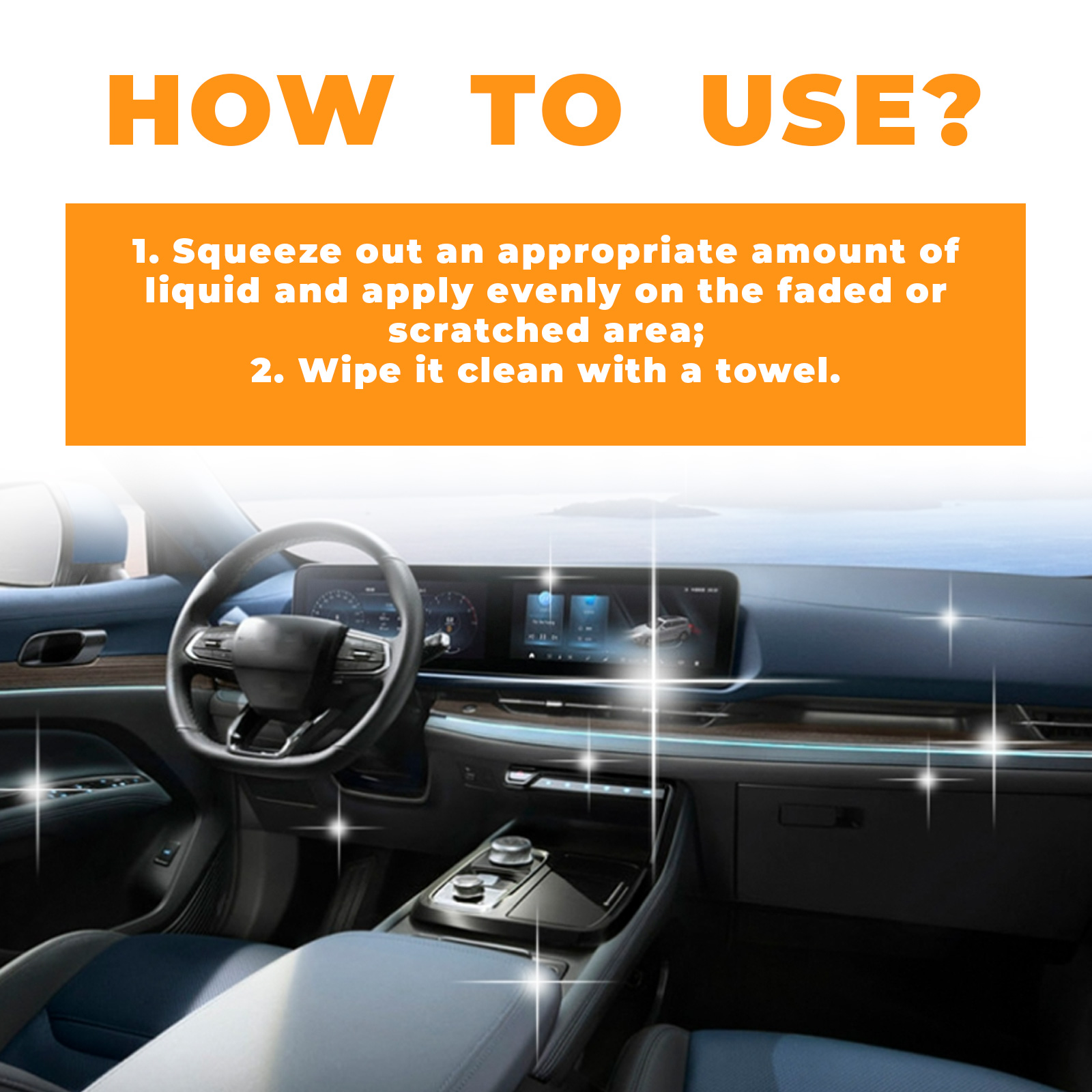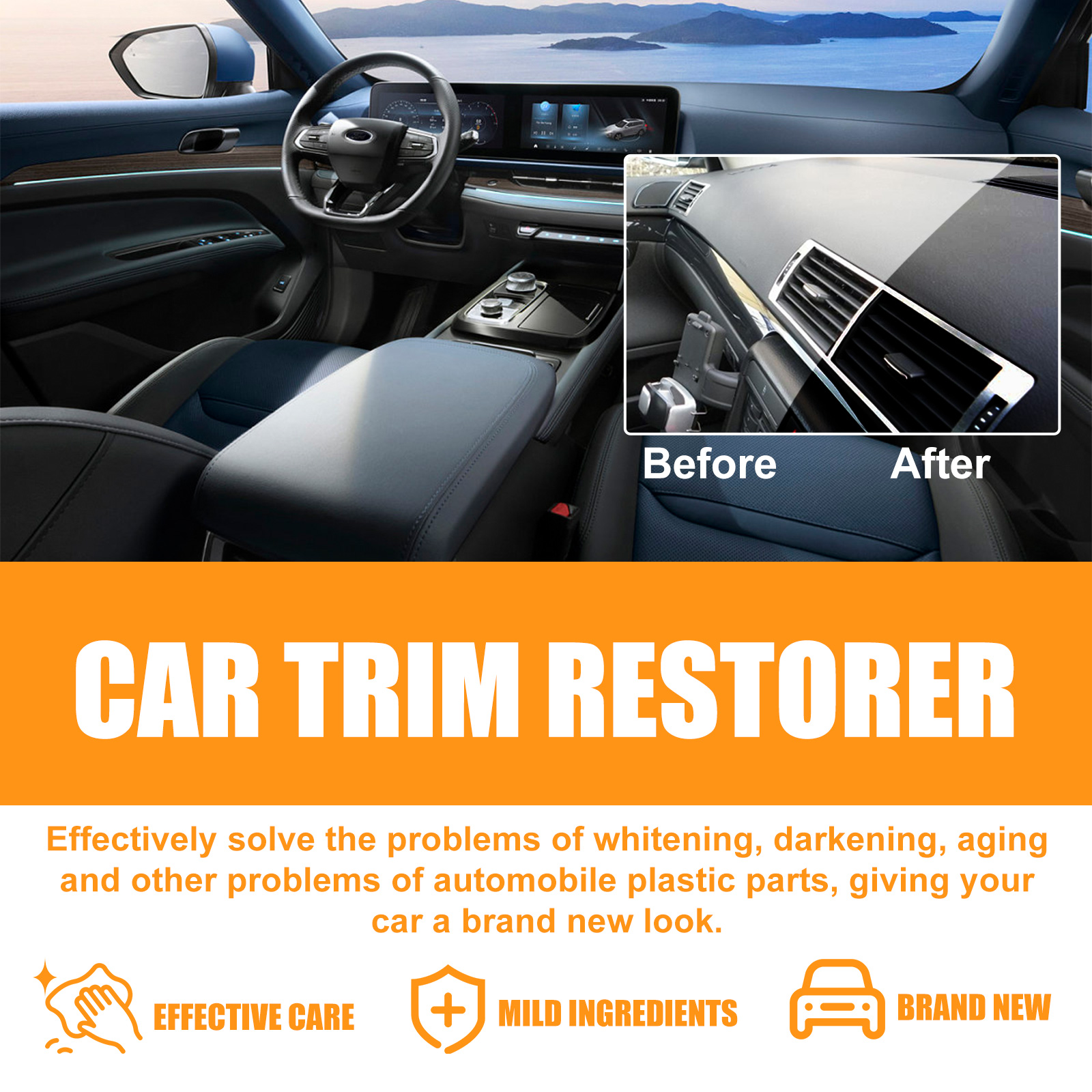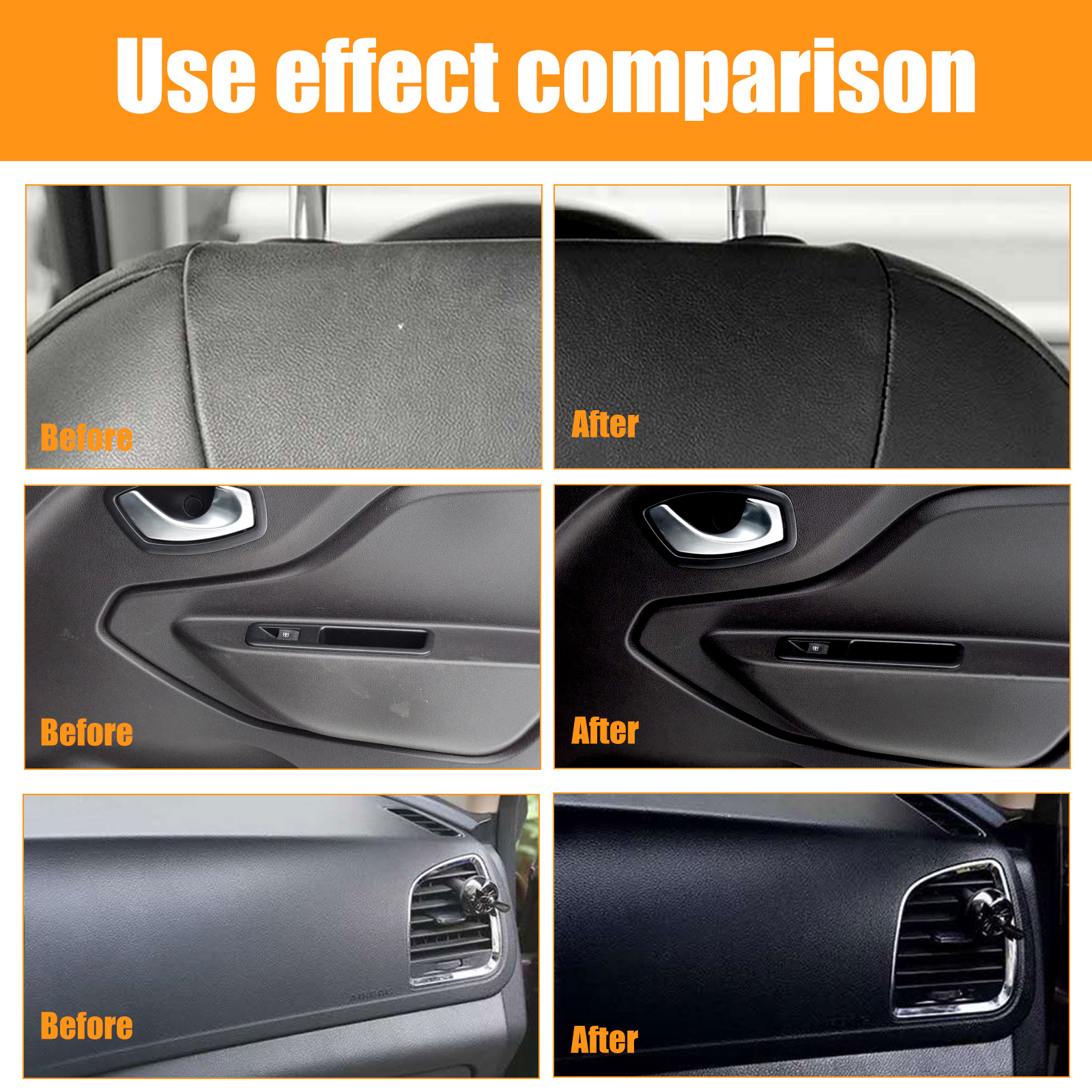 Our car trim restorers contain acetone, polyvinyl butyral. It can improve the texture and color of your car's interior decoration, giving you a whole new driving experience. Simple and effective care for your car to restore its original brightness and color. The way to use it is very simple: squeeze out the right amount of liquid, evenly apply it to the faded or scratched area, and wipe it off with a towel. And you can clean the interior.