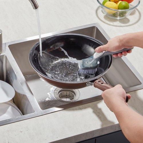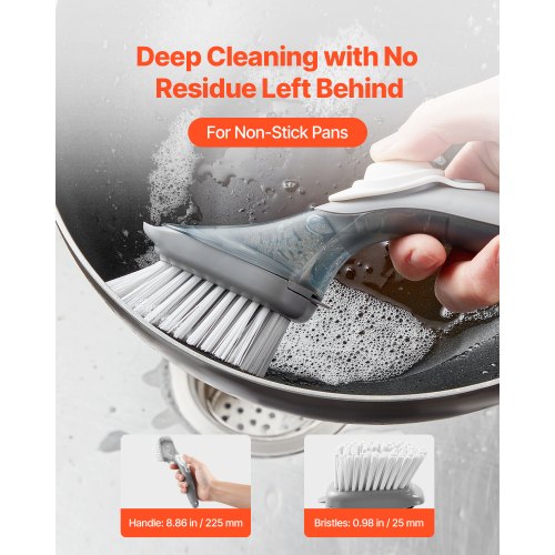 VEVOR Soap Dispensing Dish Brush, Kitchen Scrub Brushes with 3 Brush Heads, Dish Cleaning Brushes with PP Handle and Curved Bristles, Ideal for Pots, Pans, Sink and StoveOne-Touch Liquid DispensingEfficient Stain RemovalNon-slip & Effort-savingConvenient Hanging DesignEasy to UseVersatile FunctionalityBristle Exposure Length: ≥0.98 in / 25 mm,Brush Bristles: PET Bristles,Color: White Bristles / Grey Handle + Transparent ABS,Item Model Number: B003-1-3,Package Quantity: 3 PCS,Product Dimensions (L x W x H): 8.86 x 1.97 x 4.72 in / 225 x 50 x 120 mm,Net Weight: 0.40 lbs / 0.18 kg,Handle Material: PP, ABS, TPR