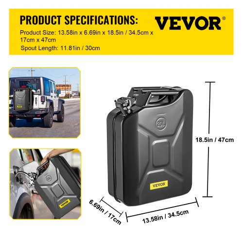 VEVOR Jerry Fuel Can, 5.3 Gallon / 20 L Portable Jerry Gas Can with Flexible Spout System, Rustproof & Heat-resistant Steel Fuel Tank for Cars Trucks Equipment, Black5.3 Gal Jerry CanSuperb-quality Steel CanAirtight Sealing LockImproved Flexible SpoutEasy Carrying & StorageWide ApplicationCapacity: 5.3 US Gallons / 20 L,Color: Black,Model: 1X20LBLACK,Style: Military,Quantity: 1,Material: 0.8 mm Cold-rolled Steel,Spout Diameter: 0.79 in / 20 mm,Spout Length: 11.8 in / 300 mm,Weight: 9.83 lbs / 4.46 kg