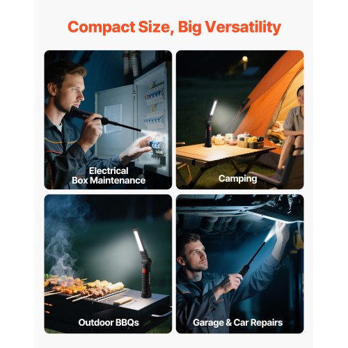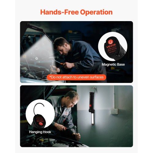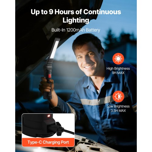 VEVOR Rechargeable LED Work Light 1200mAh Magnetic Flashlight with Magnetic Base<br/>Foldable Design<br/>Five Modes Available<br/>High Compatibility<br/>Compact & Easy to Carry<br/>Durable & Convenient<br/>Magnetic Base<br/>Main Light Low Brightness Mode: ≥50 lm,Color: Black,Materials: ABS (Housing), Aluminum Alloy (Lampshade),Main Light High Mode Runtime: ≥3.5 hours,Unfolded Dimensions: 10.6 x 1.9 x 1.4 in/270 x 48 x 34.5 mm,Auxiliary Light: ≥15 lm,Battery Type: 18650 Rechargeable Battery (1200 mAh),LED Service Life: ≥ 30,000 Hours,Battery Service Life: 200 Cycles,Item Model Number: GZ-01,Main Light High Brightness Mode: ≥200 lm,Folded Dimensions: 5.8 x 2.1 x 1.4 in/147 x 52 x 34.5 mm,Net Weight: 0.62 lbs/0.28 kg,Main Light Low Mode Runtime: ≥9.0 hours