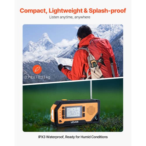 VEVOR Emergency Weather Radio Solar Hand Crank Emergency Radio 2000mAh Battery<br/>Stay Informed Anywhere<br/>All-in-One Outdoor Companion<br/>Dual Alert System<br/>Faster Weather Alerts<br/>Ready Anytime, Anywhere<br/>Real-Time Status Indicators<br/>Battery Capacity: 2000mAh,Waterproof Rating: IPX3,Radio Volume: ≥78dB,Working Voltage: DC2.7V-4.2V,Shell Main Material: ABS,Item Model Number: MD-092P,Battery Cells: 1 Cell,Product Dimensions: 6.30 x 1.97 x 3.19 inch / 160 x 50 x 81 mm,Net Weight: 0.7 lbs / 0.33 kg,Power: 8W