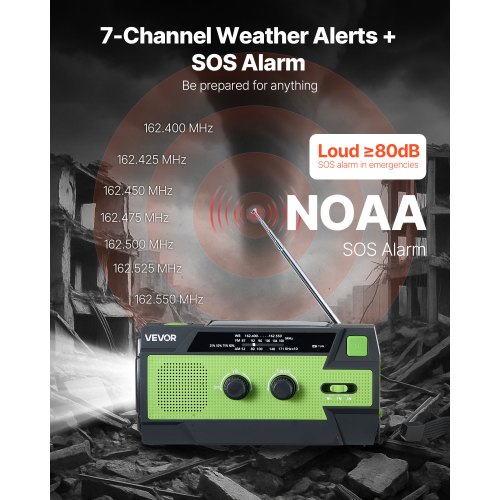 VEVOR Emergency Weather Radio Solar Hand Crank Emergency Radio 4000mAh Battery<br/>Stay Informed Anywhere<br/>All-in-One Outdoor Companion<br/>Dual Alert System<br/>Faster Weather Alerts<br/>Ready Anytime, Anywhere<br/>Precise Power Display<br/>Battery Capacity: 4000mAh,Waterproof Rating: IPX3,Radio Volume: ≥80dB,Working Voltage: DC2.7V-4.2V,Shell Main Material: ABS,Item Model Number: MD-090P,Battery Cells: 2 Cells,Product Dimensions: 6.30 x 2.48 x 3.19 inch / 160 x 63 x 81 mm,Net Weight: 0.9 lbs / 0.4 kg,Power: 10W