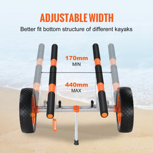VEVOR Heavy Duty Kayak Cart, 450lbs Load Capacity, Detachable Canoe Trolley Cart with 12'' Solid Tires, Adjustable Width & Nonslip Support Foot, for Kayaks Canoes Paddleboards Float Mats Jon BoatsAluminum Alloy Thickened FrameSingle Foot SupportTie-Down Strap BuckleAll-Terrain Solid TiresAdjustable WidthHigh CompatibilityNonslip Tie-Down Strap: (W25*L3600mm)*1,Tire Material: Solid PU Tires,Product Storage: Detachable Storage,Product Dimensions: 31.5 x 29.6 x 18.5 inch / 800 x 751 x 470 mm,Net Weight: 11.5 lbs / 5.2 kg,Wheels Configuration: 2 Wheels+Single Support Foot,Main Material: Aluminum Alloy
