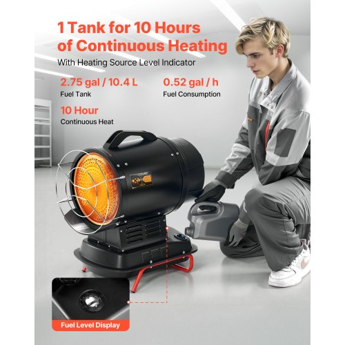 VEVOR 125000 BTU Radiant Heater Kerosene Diesel with Temp Control for Industry<br/>Rapid Heating<br/>Strong Construction<br/>Auto Monitoring System<br/>Quick One-Button Start<br/>Wide Range Use<br/>Thoughtful Protection Design<br/>Tank Capacity: 9.25 Gal / 35 L,Temperature Control: 41℉ - 99℉ / 5℃ - 37.2℃ (Digital),Power Source: AC120V 60Hz,Color: Black + Orange,Item Model Number: BGO1402-125K,Item Dimensions: 36.4 x 25 x 34 inch / 925 x 635 x 860 mm,Net Weight: 64.6 lbs / 29.3 kg,Main Material: Q235A Steel,Heat Output (BTU): 125,000 BTU (-5%, +10%)