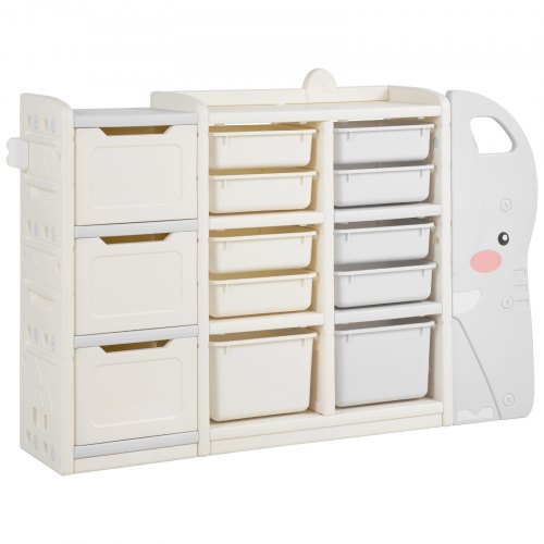 4-Tier Kids Toy Storage with 10 Plastic Movable Bins Elephant-ShapeMulti-Functional StorageOpen Learning AreaLarge Capacity StorageSecure MaterialsAnti-Tip SecurityGreat Present IdealStorage Bin Weight Capacity: 11 lbs / 5 kg each,Plastic Frame Dimensions: (Large): 12.7 x 10.4 x 8.3 in / 32.3 x 26.5 x 21.1 cm,Books Held by Left Grid: 8-10,Color: Beige + Gray,Material: HDPE,Product Dimensions: 53.7 x 12.6 x 38.2 in / 136.5 x 32 x 97 cm ,Right Grid Dimensions (Whole Right Column): 28.7 x 12.6 x 36.0 in / 73 x 32 x 91.5 cm,Left Grid Weight Capacity: 33 lbs / 15 kg per layer,Left Grid Dimensions (Whole Left Column): 15 x 12.6 x 36.0 in / 38 x 32 x 91.5 cm,Item Model Number: XXSNJ-006,Right Grid Total Weight Capacity: 33 lbs / 15 kg,Inclination Angle: 25°,Net Weight: 40.6 lbs / 18.4 kg