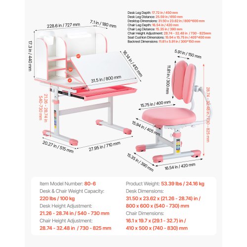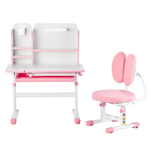 VEVOR Kids Desk and Chair Set, Study Desk and Chair for Kids with Bookshelf & Storage Drawer, Adjustable Height & 0-40° Tilted Desktop Desk and Chair, Study Table for Bedroom & Study Room, PinkSpacious Writing DeskErgonomic Chair DesignHeight Adjustable for GrowthEfficient Storage ManagementDurable and Sturdy ConstructionEasy AssemblyDesk Height Adjustment: 21.26 - 28.74 in / 540 - 730 mm,Chair Height Adjustment: 28.74 - 32.48 in / 730 - 825 mm,Desktop Shape: 28.6 x 7.1 x 17.3 in / 727 x 180 x 440 mm,Chair Dimensions: 16.1 x 19.7 x (29.1 - 32.7) in / 410 x 500 x (740 - 830) mm,Item Model Number: 80-6,Product Weight: 53.39 lbs / 24.16 kg,Desk Dimensions: 31.50 x 23.62 x (21.26 - 28.74) in / 800 x 600 x (540 - 730) mm,Desk & Chair Weight Capacity: 220 lbs / 100 kg