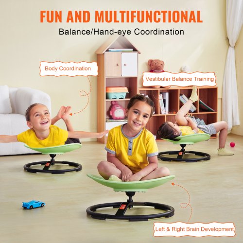 VEVOR Kids Swivel Chair, 220 LBS Capacity, Sensory Spinning Chair, Autistic Kids Sensory Toy Chair with Non-Slip Metal Base, Toddler Sit and Spin Chair for Coordination Balance Focus Training GreenSensory Training Swivel Chair360° Swivel DesignSecure and Sturdy StructureSecure MaterialsWide ApplicationEasy AssemblyWeight Capacity: 220 lbs / 100 kg,Suitable Age Range: 3-12 Years,Color: Green,Style: Round,Material: Metal + PP Plastic,Base Dimensions: φ20.5 in / φ520 mm,Model Number: LY-8305,Product Dimensions: 21.06 x 19.88 x 11.61 in / 535 x 505 x 295 mm,Net Weight: 11.2 lbs / 5.1 kg
