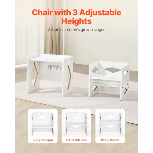 VEVOR Montessori Weaning Table and Chair Set, Wooden Toddler Table and Chair Set for Aged 1-5, Adjustable Height Kids Montessori Chair and Activity Table, Ideal for Reading, Eating, Playing - WhiteMultifunctional Weaning Table and Chair SetVersatile Use TablePremium Quality Wood MaterialsStable and Secure SupportSimple and Quick AssemblySecure and Reliable PackagingTable: 15.4 x 12 x 15 in / 392 x 300 x 381 mm,With Beautiful Pattern: Yes,Chair: 13.1 x 11.2 x 13.6 in / 332 x 285 x 345 mm,Color: White,Item Model Number: SYD04,Product Weight: 14.8 lbs / 6.7 kg,Style: One Table One Chair,Adjustable: 3-level adjustment,Main Material: MDF