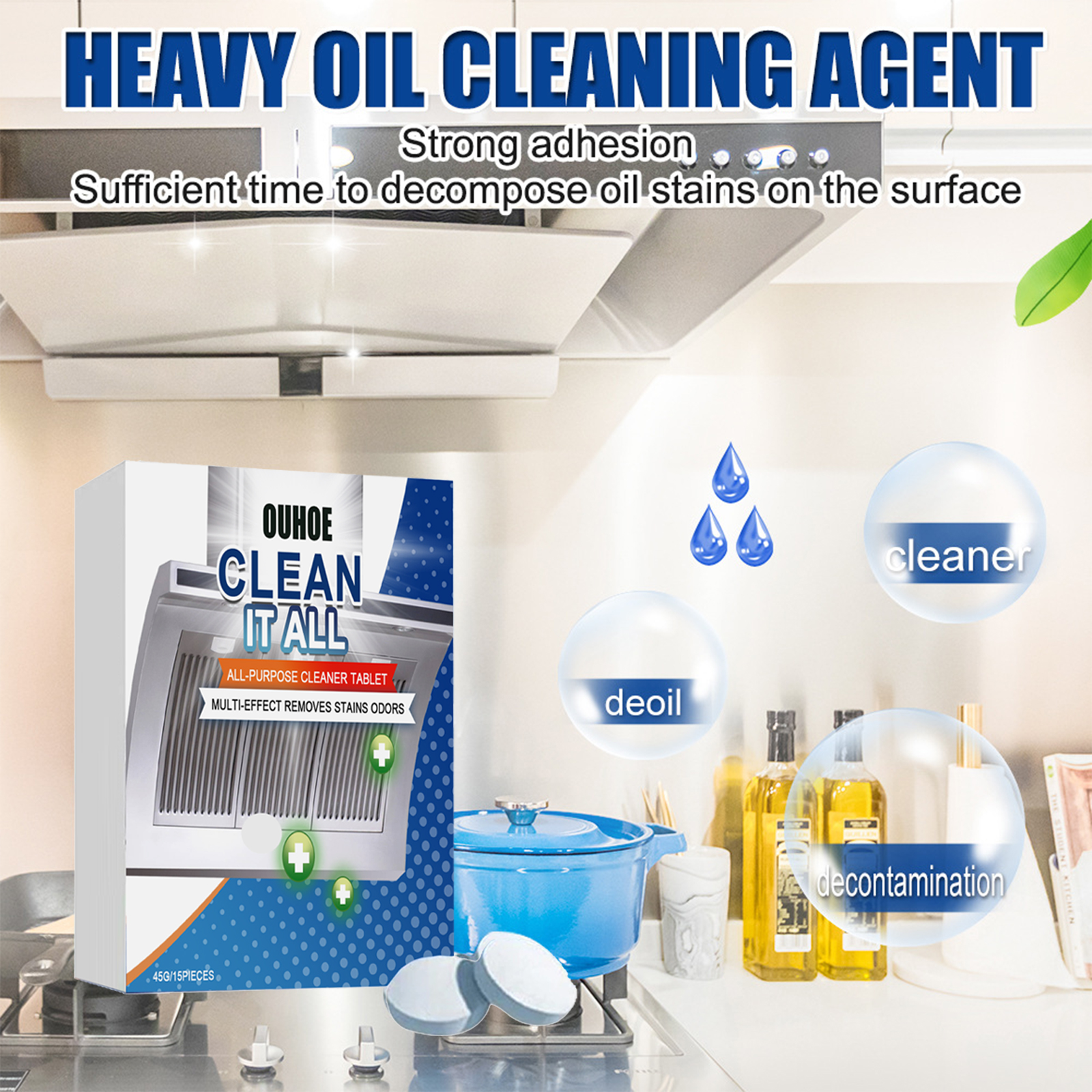 Our kitchen Oil cleaning effervescent tablets contain surfactants. It can gently clean kitchen oil stains, stubborn dirt, etc., can penetrate grease and dirt, and quickly clean kitchen surfaces and tableware. Its use method is very simple: 1. Pour 1-2 pieces of this product into water and wait for this product to completely dissolve in water. The dissolution time is 15 to 30 minutes. 2. Let it sit for a while and then pour the water away. Kitchen oil cleaning effervescent tablet decontamination, decomposition of surface stains, strong cleaning power, strong adhesion.