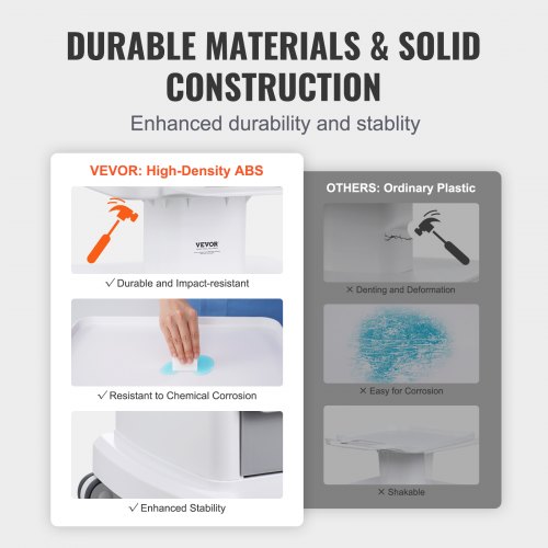 VEVOR 4 Tiers Lab Carts Mobile Medical Cart with 3 Drawers & 1 Top Tray White, Trolley Storage Cart with ABS Material, Lab Rolling Cart with 4 Silent Wheels for Lab, Clinic, Hospital, Salon, OfficeHigh Load Capacity and StabilityLarge Capacity StorageDurable MaterialEasy MobilityErgonomic DesignVersatile UseTray: ABS, 395 x 455 mm / 15.4 x 17.9 in; Depth 19 mm / 0.75 in; Thickness 5 mm,Wheels: PA6, Diameter 65 mm / 2.6 in, Wheel Width 2.1 in / 53 mm, 4 Wheels (2 with Brakes),Item Model Number: FY-1T3C,Product Weight: 27 lbs / 12.3 kg,Max Load Capacity: 110 lbs / 50 kg,Drawer: ABS, 340 x 295 x 100 mm / 13.4 x 11.6 x 3.9 in,Product Dimensions: 18.3 x 18.3 x 30.7 in / 465 x 465 x 780 mm