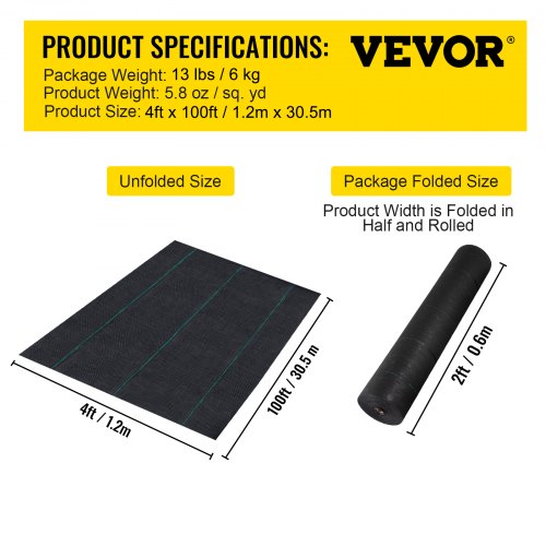 VEVOR Garden Weed Barrier Fabric, 5.8 OZ Heavy Duty Landscape Fabric, 4ft x 100ft Weed Block Control for Garden Ground Cover, Woven Geotextile Fabric for Landscaping, Gardening, Underlayment, BlackDual-layer MaterialPremium Weed ControlExcellent PermeabilityIncrease Soil NutrientEasy to DIYWidely UsedNote:This product width is packaged in HALF-FOLD and rolled,Model: VV-FCB-PE 4*100FT 5.8OZ,Product Weight: 5.8 oz/sq. Yd,Material: Polypropylene Fabric,Package Folded Size: 9.8" x 9.8" x 25.6",Package Weight: 13lb / 6 kg,Dual Layer: Woven & Needle Punched,Product Size: 4 x 100 ft / 1.2 x 30.5 m