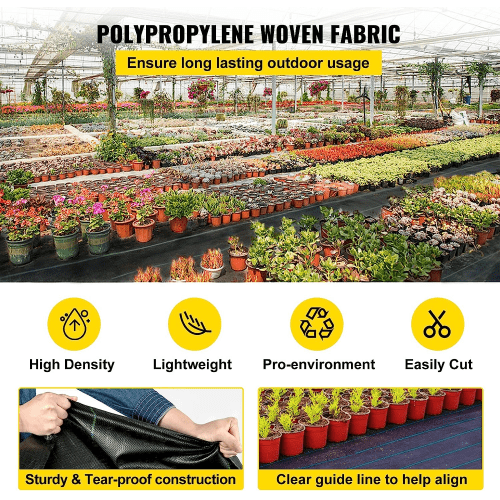 VEVOR Weed Barrier Landscape Fabric, 5 x 250 ft, 5 Oz Premium Woven Ground Cover Heavy Duty PP Material & Easy Setup, Single-Layer for Outdoor Garden, Lawn, Driveway, BlackDurable PP MaterialHigh Water FlowSoil FriendlyEasy InstallationWeed ControlWidely UsedNote:This product width is packaged in HALF-FOLD and rolled.,Model: VV-WB-5250,Product Weight: 5 oz,Material: Polypropylene Woven Fabric,Package Folded Size: 9.6" x 9.6" x 32.3",Package Weight: 38.5 lbs / 13 kg,Product Size: 5 x 250 ft / 1.5 x 76.2 m