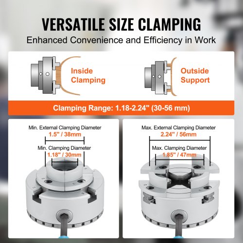 VEVOR KP2-3/4 Lathe Chuck, 4-Jaw 2.75" Diameter, Metal Lathe Chuck Turning Machine Accessories, Self-centering Tool, for Lathe, Precision Machining, Grinding Machines, Milling MachinesExceptional DurabilityExceptional Operating PrecisionThe Flexibility of Adjustable JawsEasy-to-Get-Started User ExperienceVersatile Single JawWidely UseClamping Range (Inner): 1.18-1.85 inches (30-47 mm),Outer Diameter Runout: ≤0.15 mm,Test Bar Radial Runout: ≤0.40 mm at a distance of 50 mm,Surface Treatment and Color: ≤Ra1.6, chrome-plated natural color,Test Ring End Face Runout: ≤0.15 mm,Model: KP2-3/4,Support Range (Outer): 1.5-2.24 inches (38-56 mm),Chuck Internal Thread: 1*8TPI,Product Dimensions: φ70 x 65 mm,Chuck Outer Diameter: 2.75 inches / φ70 mm,Net Weight: 3.2 pounds / 1.47 kg,Main Material: 45#