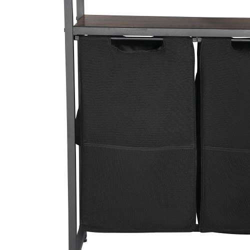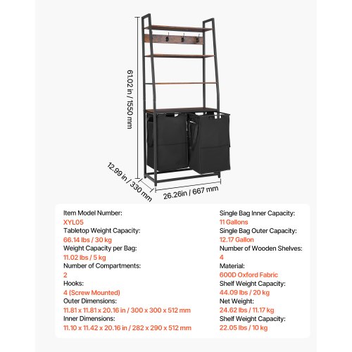 VEVOR 4 Tiers Laundry Sorter Tall Laundry Hamper with Shelves & Hooks 2 Section<br/>Efficient Storage<br/>Easy Mobility<br/>Multi-Use Top<br/>Versatile & Practical Design<br/>Versatile Placement<br/>Easy to Clean<br/>Outer Dimensions: 11.81 x 11.81 x 20.16 in / 300 x 300 x 512 mm,Number of Compartments: 2,Inner Dimensions: 11.10 x 11.42 x 20.16 in / 282 x 290 x 512 mm,Material: 600D Oxford Fabric,Single Inner Capacity: 11 Gallons,Product Dimensions: 26.26 x 12.99 x 61.02 in / 667 x 330 x 1550 mm,Number of Wooden Shelves: 4,Tabletop Weight Capacity: 66.14 lbs / 30 kg,Weight Capacity per Bag: 11.02 lbs / 5 kg,Single Outer Capacity: 12.17 Gallons,Shelf Weight Capacity: 22.05 lbs / 10 kg,Item Model Number: XYL05,Hooks: 4 (Screw Mounted),Net Weight: 24.62 lbs / 11.17 kg