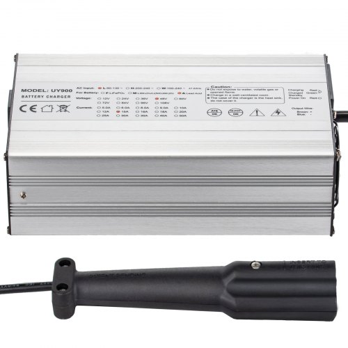 VEVOR 48 Volt 15 Amp Golf Cart Battery Charger with G29 Drive/LED Club Car Battery Charger Aluminum Shell Power Wise for Ez Go YamahaAdvanced Control ChipIntelligent Charging ModeLED Display & IndicatorsSturdy Shell & Cooling FanMultiple Electric ProtectionWide ApplicationCompatible With: E-z-Go, Club Car, Yamaha, Star, Taylor Dunn,Charger Plug: Arrow 3-Pin G29,Output Current: 15A,Color: Silver Finish,Input Voltage: 110V,Charge Period: 4-6 Hours,2 LEDs: LED1 Red (power on), LED2 Red/Green (charging/full),Dimensions (L x W x H): 249 x 134 x 69 mm/9.8 x 5.28 x 2.72'',Efficiency: ≥ 85%,Battery: Lead Acid Battery,Ventilation: Fan Cooling,Shell Material: Aluminum Alloy,Charging Mode: 3-Stage (CC, CV, Floating),Output Voltage: 48V (58.8V~48V)