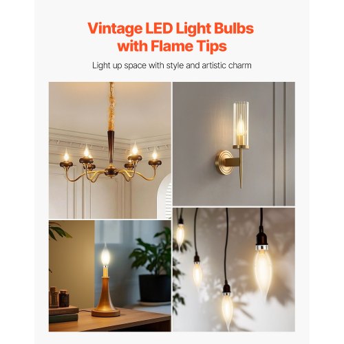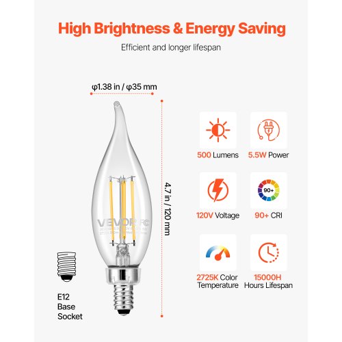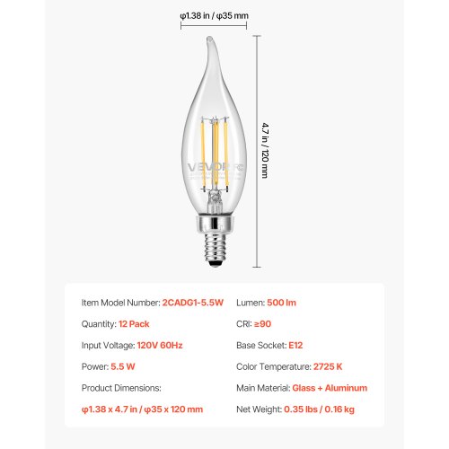 VEVOR LED Candelabra Bulbs 12-Pack Dimmable Chandelier Light Bulbs 2725K 90+ CRI<br/>Efficient and Cost-saving<br/>Flicker-Free & Stable Lighting<br/>Universal E12 Standard Base<br/>Suitable for Various Settings<br/>Soft and Natural Lighting<br/>Vintage and Elegant<br/>Base Socket: E12,Color Temperature: 2725K,Item Model Number: 2CADG1-5.5W,Lumen: 500 lm,Quantity: 12 Pack,Input Voltage: 120V 60Hz,CRI: ≥90,Product Dimensions: φ1.38 x 4.7 in / φ35 x 120 mm,Net Weight: 0.35 lbs / 0.16 kg,Power: 5.5W,Main Material: Glass + Aluminum