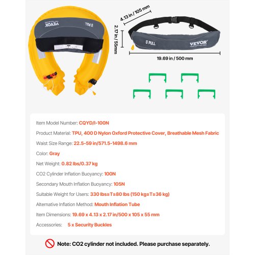 Manual Inflatable Belt Pack for Adults PFD Gray CO2 Cylinder Not IncludedSecurity FirstSurround BuoyancyComfortable & Custom FitEasy to UseVersatile Application105N High BuoyancyProduct Material: TPU, 400 D Nylon Oxford Protective Cover, Breathable Mesh Fabric,CO2 Cylinder Inflation Buoyancy: 100N,Color: Gray,Item Model Number: CQYD/I-100N,Alternative Inflation Method: Mouth Inflation Tube,Secondary Mouth Inflation Buoyancy: 105N,Item Dimensions: 19.69 x 4.13 x 2.17 in/500 x 105 x 55 mm,Net Weight: 0.82 lbs/0.37 kg,Waist Size Range: 22.5-59 in/571.5-1498.6 mm,Suitable Weight for Users: 330 lbs≥T≥80 lbs (150 kg≥T≥36 kg)