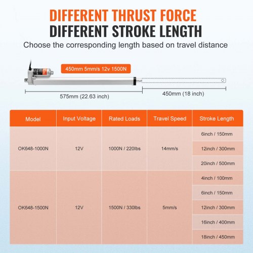 VEVOR Linear Actuator 12V, 18 Inch High Load 330lbs/1500N Linear Actuator, 0.19"/s Linear Motion Actuator with Mounting Bracket and IP54 ProtectionEnable Automation in Every StepIP54 ProtectionHigh-Quality & DurableEasy InstallationWarm TipsWide ApplicationsProtection Class: IP54,Noise Level: ≤60dB,Maximum Load/Actuation Force: 1500N,Item Model Number: OK648-1500N,Travel Speed: 0.19 inch/s / 5 mm/s,Stroke Length: 18 inch / 450 mm,Product Dimensions: 22.63 x 2.95 x 1.57 inch / 575 x 75 x 40 mm,Net Weight: 3.15 lbs / 1.43 kg (including all accessories),Main Material: Aluminum Alloy,Rated Voltage: DC12V
