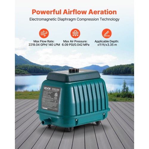 VEVOR Linear Air Pump, 2219.04 GPH Air Flow, Septic Aerator Pump, Aeration System for 11 ft Deep Ponds, Fit for Septic Tanks, Aquariums, Waste Treatment, Seafood Restaurants, Fish Farms, Hydroponics