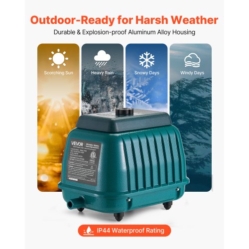 VEVOR Linear Air Pump Septic Aerator Pump 2219.04GPH Aeration for 11ft Deep Pond<br/>Linear Silent Aeration Pump<br/>High-Efficiency Aeration<br/>Silent Operation<br/>Easy Installation<br/>One Pump, Multiple Uses<br/>Air Filtration Design<br/>Operating Noise: ≤47 dBA,Waterproof Rating: IP44,Voltage: AC 120V 60Hz,Item Model Number: LP100,Maximum Flow Rate: 2219.04 GPH/140 LPM,Air Pressure: 6.09 PSI/0.042 MPa,Applicable Depth: ≤11 ft/≤3.35 m,Material: Aluminum alloy housing,Filtration Method: Built-in Air Filter,Product Dimensions: 11.61 x 7.87 x 8.46 in/295 x 200 x 215 mm,Net Weight: 14.11 lbs/6.4 kg,Power: 100W