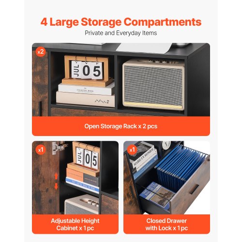 VEVOR Wood File Cabinet, Mobile Filing Cabinet with Open Shelves, Lockable Lateral Rolling File Storage with Adjustable Shelves, Free Standing Printer Stand for Home, Office, School, Rustic BrownMulti-Functional Storage CabinetZoned Storage DesignHigh-Quality MaterialsLarge Capacity & Smooth OperationVersatile for Any SceneQuick & Easy AssemblyNumber of Drawers: 1 Drawer with 1 Cabinet and 2 Compartments,Weight Capacity: 150 lbs / 68 kg,Color: Brown + Black,Item Model Number: KLHW-03,Product Dimensions: 36.6 x 15.8 x 25 in / 93 x 40 x 63.5 cm,Net Weight: 56.3 lbs / 25.55 kg,Main Material: Particle Board